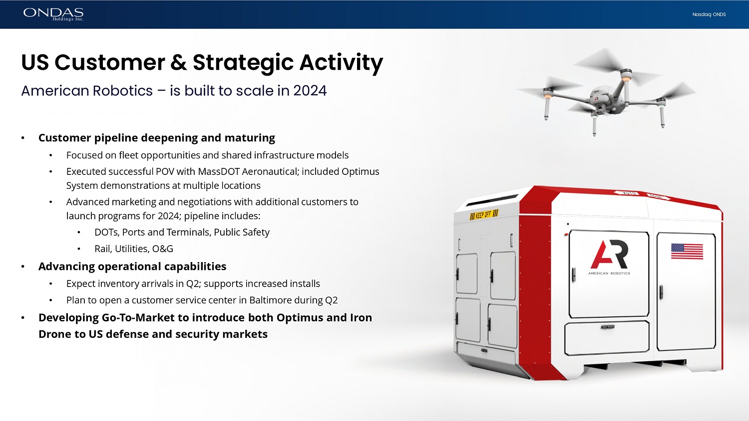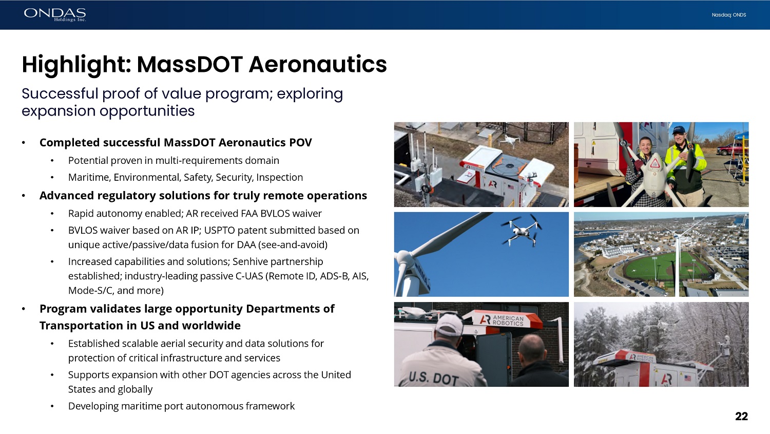 21 Nasdaq: ONDS US Customer & Strategic Activity American Robotics – is built to scale in 2024 • Customer pipeline deepening and maturing • Focused on fleet opportunities and shared infrastructure models • Executed successful POV with MassDOT Aeronautical; included Optimus System demonstrations at multiple locations • Advanced marketing and negotiations with additional customers to launch programs for 2024; pipeline includes: • DOTs, Ports and Terminals, Public Safety • Rail, Utilities, O&G • Advancing operational capabilities • Expect inventory arrivals in Q2; supports increased installs • Plan to open a customer service center in Baltimore during Q2 • Developing Go - To - Market to introduce both Optimus and Iron Drone to US defense and security markets
