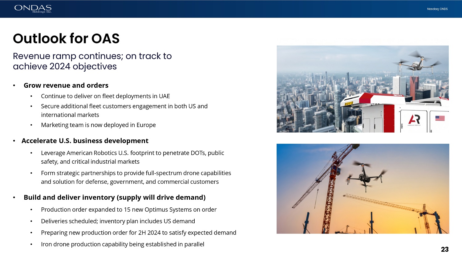22 Nasdaq: ONDS Highlight: MassDOT Aeronautics Successful proof of value program; exploring expansion opportunities • Completed successful MassDOT Aeronautics POV • Potential proven in multi - requirements domain • Maritime, Environmental, Safety, Security, Inspection • Advanced regulatory solutions for truly remote operations • Rapid autonomy enabled; AR received FAA BVLOS waiver • BVLOS waiver based on AR IP; USPTO patent submitted based on unique active/passive/data fusion for DAA (see - and - avoid) • Increased capabilities and solutions; Senhive partnership established; industry - leading passive C - UAS (Remote ID, ADS - B, AIS, Mode - S/C, and more) • Program validates large opportunity Departments of Transportation in US and worldwide • Established scalable aerial security and data solutions for protection of critical infrastructure and services • Supports expansion with other DOT agencies across the United States and globally • Developing maritime port autonomous framework