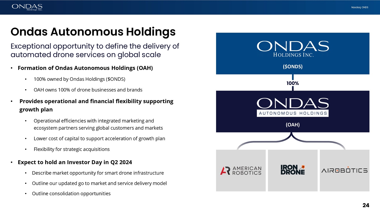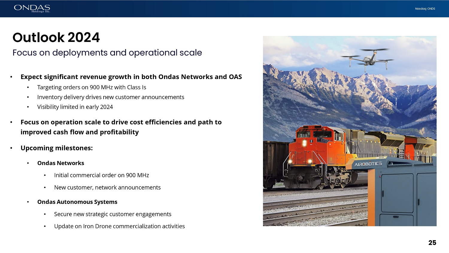24 Nasdaq: ONDS Ondas Autonomous Holdings Exceptional opportunity to define the delivery of automated drone services on global scale • Formation of Ondas Autonomous Holdings (OAH) • 100% owned by Ondas Holdings ($ONDS) • OAH owns 100% of drone businesses and brands • Provides operational and financial flexibility supporting growth plan • Operational efficiencies with integrated marketing and ecosystem partners serving global customers and markets • Lower cost of capital to support acceleration of growth plan • Flexibility for strategic acquisitions • Expect to hold an Investor Day in Q2 2024 • Describe market opportunity for smart drone infrastructure • Outline our updated go to market and service delivery model • Outline consolidation opportunities (OAH) ($ONDS) 100%PG0