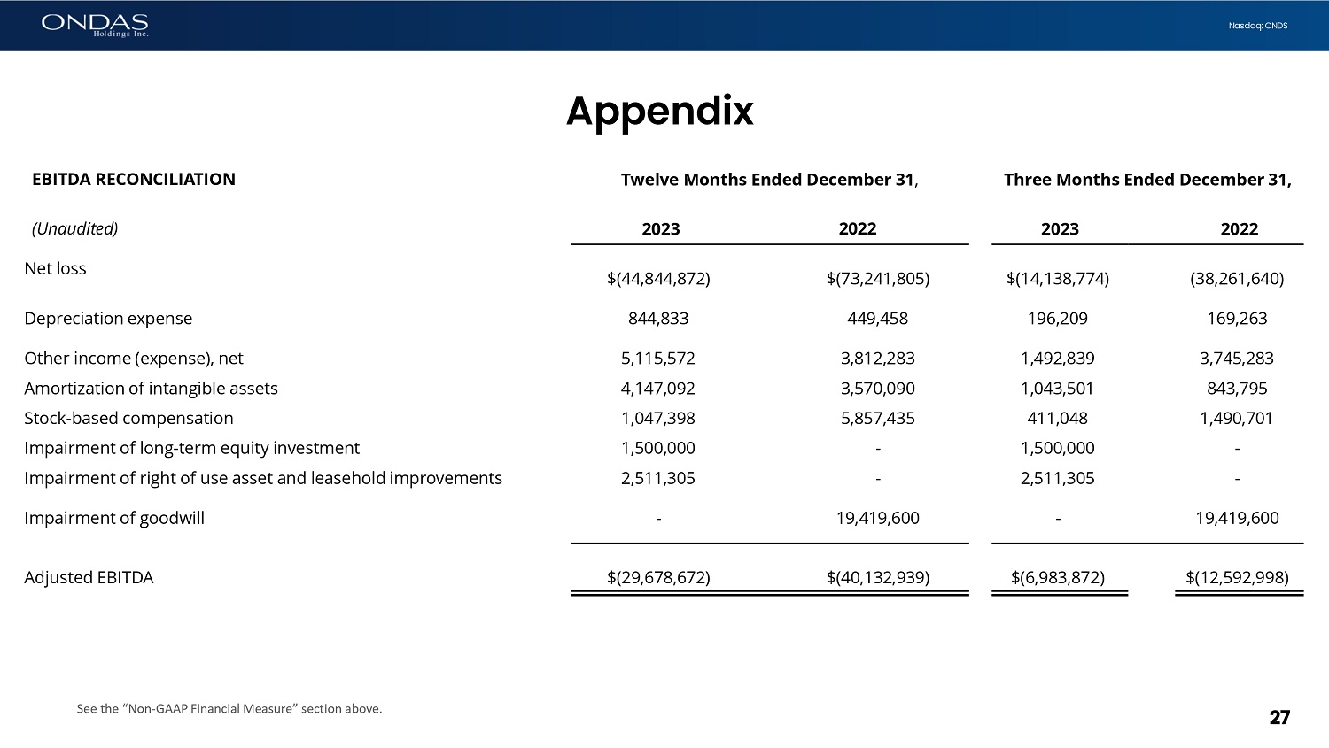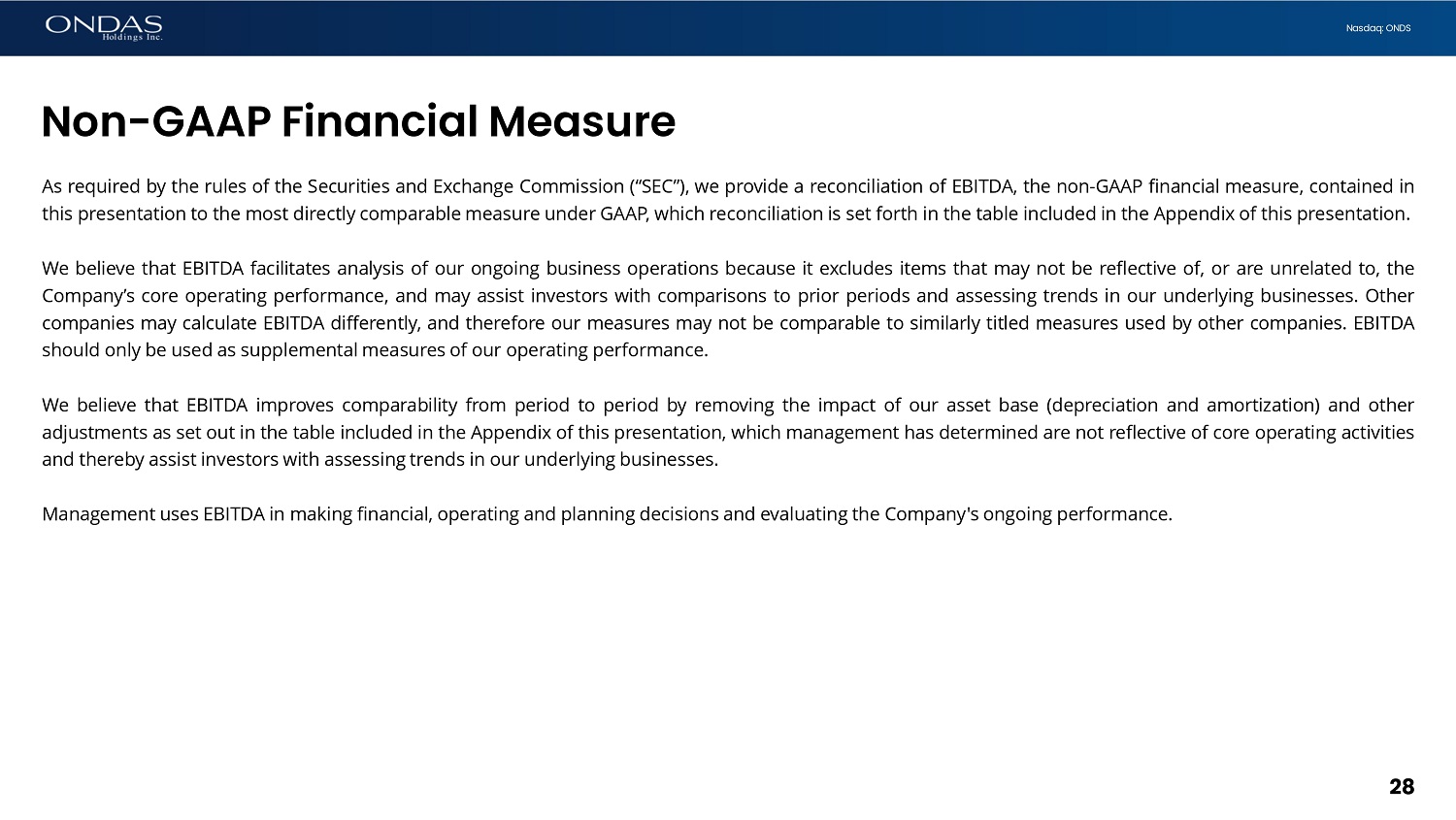 27 Nasdaq: ONDS Three Months Ended December 31, ௗ Twelve Months Ended December 31 , ௗ EBITDA RECONCILIATION 2022 ௗ 2023 ௗ 2022 2023 ௗ (Unaudited) (38,261,640) ௗ $(14,138,774) ௗ $(73,241,805) $(44,844,872) Net loss 169,263 ௗ 196,209 ௗ 449,458 ௗ 844,833 Depreciation expense 3,745,283 1,492,839 3,812,283 5,115,572 Other income (expense), net 843,795 1,043,501 3,570,090 4,147,092 Amortization of intangible assets 1,490,701 411,048 5,857,435 1,047,398 Stock - based compensation - 1,500,000 - 1,500,000 Impairment of long - term equity investment - 2,511,305 - 2,511,305 Impairment of right of use asset and leasehold improvements 19,419,600 ௗ - ௗ 19,419,600 ௗ - Impairment of goodwill $(12,592,998) ௗ $(6,983,872) ௗ $(40,132,939) $(29,678,672) Adjusted EBITDA See the “Non - GAAP Financial Measure” section above. Appendix