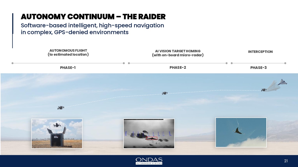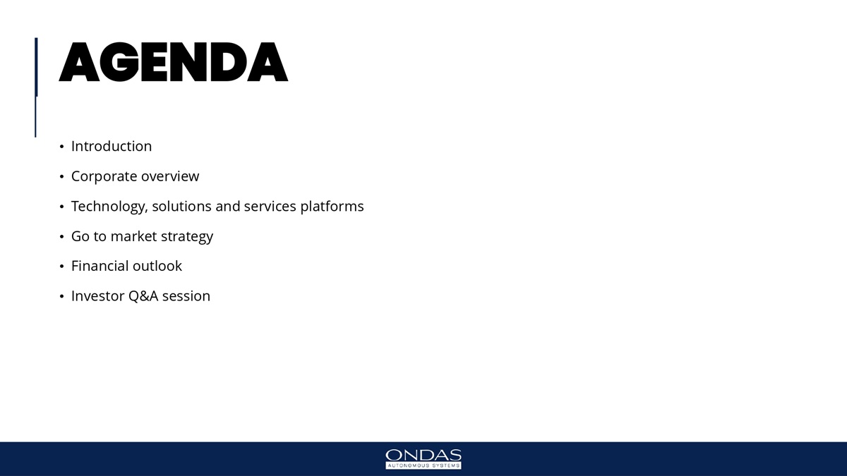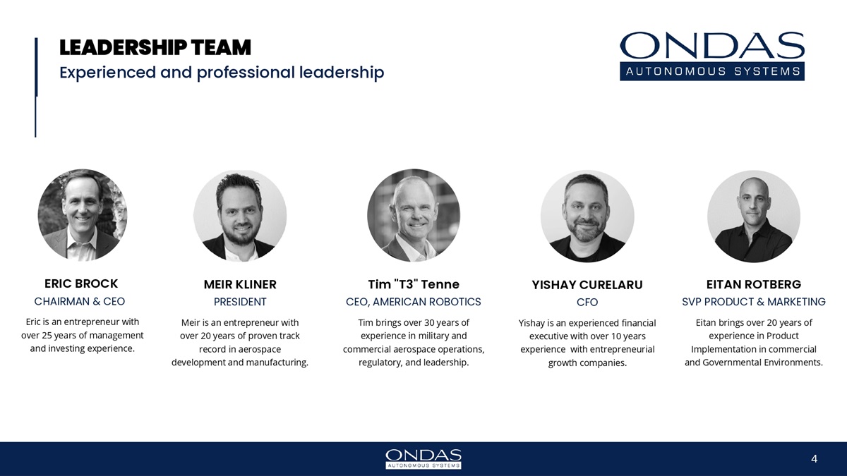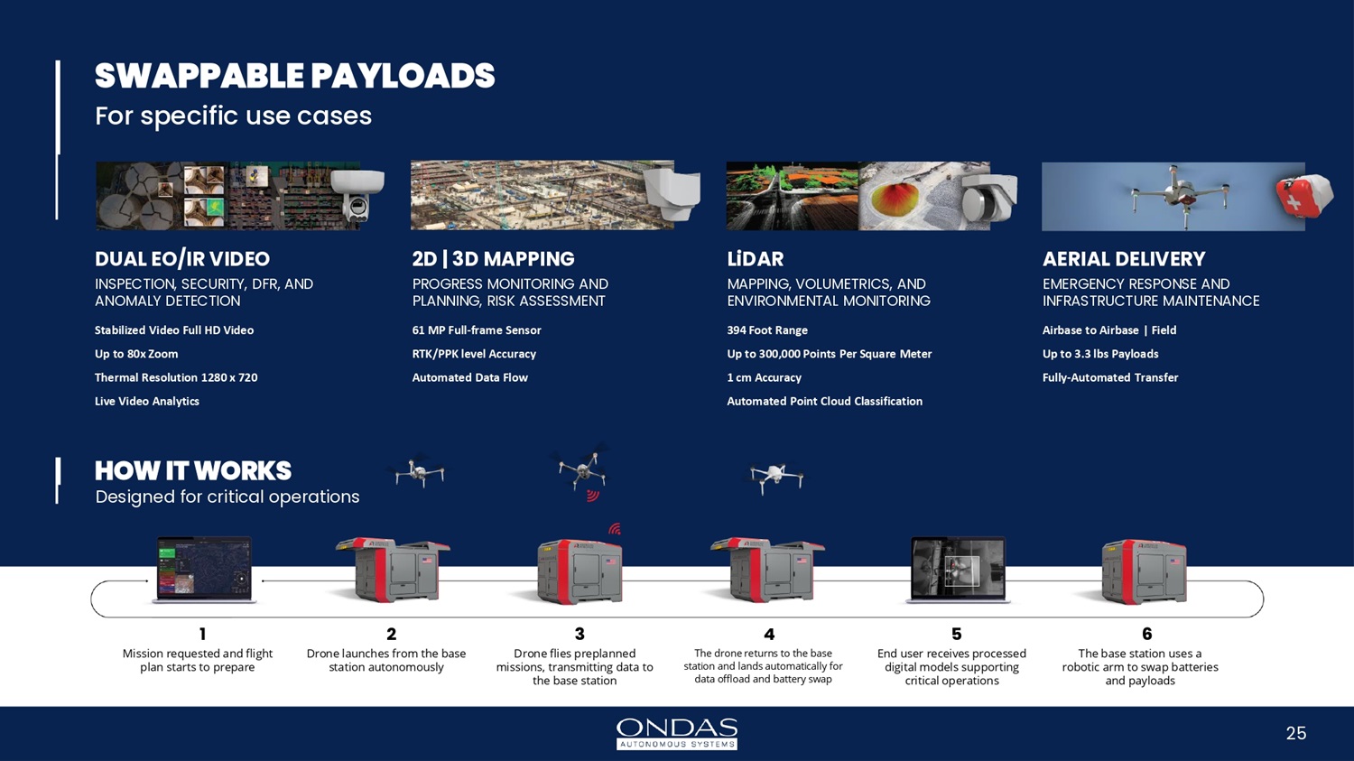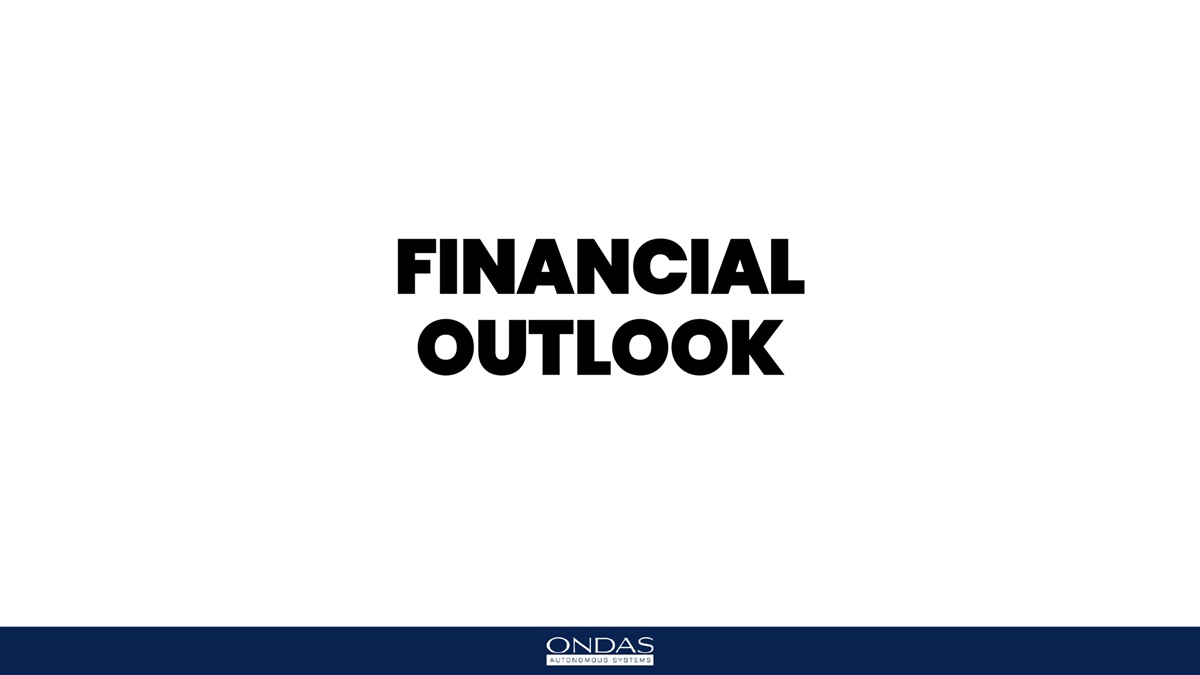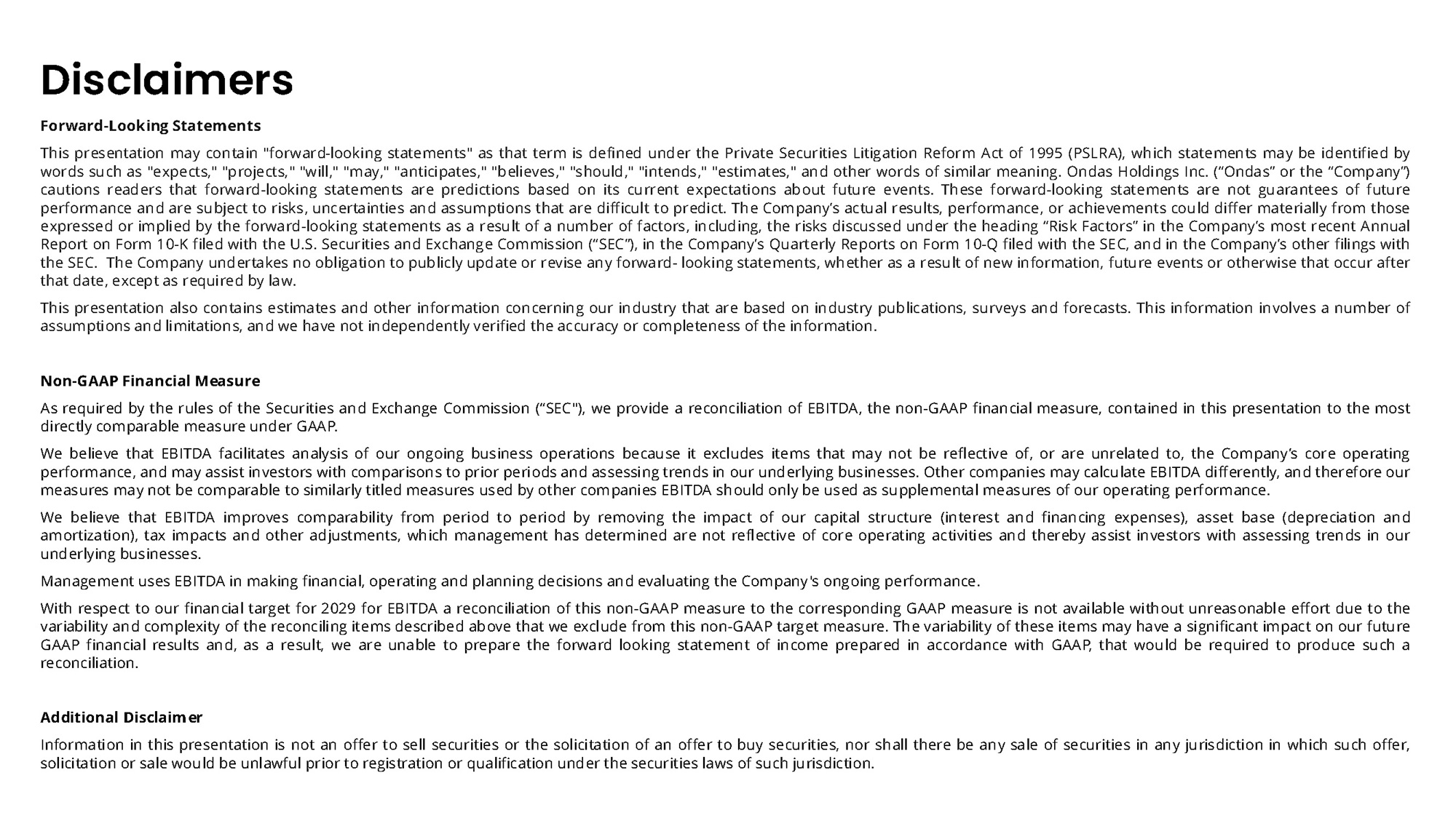 This presentation may contain "forward - looking statements" as that term is defined under the Private Securities Litigation Reform Act of 1995 (PSLRA), which statements may be identified by words such as "expects," "projects," "will," "may," "anticipates," "believes," "should," "intends," "estimates," and other words of similar meaning . Ondas Holdings Inc . (“Ondas” or the “Company”) cautions readers that forward - looking statements are predictions based on its current expectations about future events . These forward - looking statements are not guarantees of future performance and are subject to risks, uncertainties and assumptions that are difficult to predict . The Company’s actual results, performance, or achievements could differ materially from those expressed or implied by the forward - looking statements as a result of a number of factors, including, the risks discussed under the heading “Risk Factors” in the Company’s most recent Annual Report on Form 10 - K filed with the U . S . Securities and Exchange Commission (“SEC”), in the Company’s Quarterly Reports on Form 10 - Q filed with the SEC, and in the Company’s other filings with the SEC . The Company undertakes no obligation to publicly update or revise any forward - looking statements, whether as a result of new information, future events or otherwise that occur after that date, except as required by law . This presentation also contains estimates and other information concerning our industry that are based on industry publications, surveys and forecasts . This information involves a number of assumptions and limitations, and we have not independently verified the accuracy or completeness of the information . Non - GAAP Financial Measure As required by the rules of the Securities and Exchange Commission (“SEC"), we provide a reconciliation of EBITDA, the non - GAAP financial measure, contained in this presentation to the most directly comparable measure under GAAP . We believe that EBITDA facilitates analysis of our ongoing business operations because it excludes items that may not be reflective of, or are unrelated to, the Company’s core operating performance, and may assist investors with comparisons to prior periods and assessing trends in our underlying businesses . Other companies may calculate EBITDA differently, and therefore our measures may not be comparable to similarly titled measures used by other companies EBITDA should only be used as supplemental measures of our operating performance . We believe that EBITDA improves comparability from period to period by removing the impact of our capital structure (interest and financing expenses), asset base (depreciation and amortization), tax impacts and other adjustments, which management has determined are not reflective of core operating activities and thereby assist investors with assessing trends in our underlying businesses . Management uses EBITDA in making financial, operating and planning decisions and evaluating the Company's ongoing performance . With respect to our financial target for 2029 for EBITDA a reconciliation of this non - GAAP measure to the corresponding GAAP measure is not available without unreasonable effort due to the variability and complexity of the reconciling items described above that we exclude from this non - GAAP target measure . The variability of these items may have a significant impact on our future GAAP financial results and, as a result, we are unable to prepare the forward looking statement of income prepared in accordance with GAAP, that would be required to produce such a reconciliation . Disclaimer