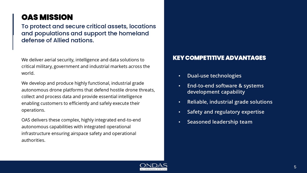 Y I SHAY C U RELARU CFO Yishay is an experienced financial executive with over 10 years experience with entrepreneurial growth companies. M E I R K L I NER PRESIDENT Meir is an entrepreneur with over 20 years of proven track record in aerospace development and manufacturing. Ti m " T 3 " T ef i fie CEO, AMERICAN ROBOTICS Tim brings over 30 years of experience in military and commercial aerospace operations, regulatory, and leadership. E R I C B ROCK CHAIRMAN & CEO Eric is an entrepreneur with over 25 years of management and investing experience. LEADERS H IP TE AM E x p e r i e nced and p r o f e ssio nal l e a d e rship EI T AN RO T BE RG SV P PRO DU C T & M A RKE TING Eitan brings over 20 years of experience in Product Implementation in commercial and Governmental Environments. 4