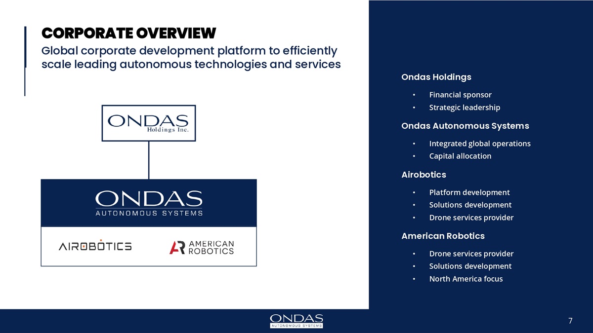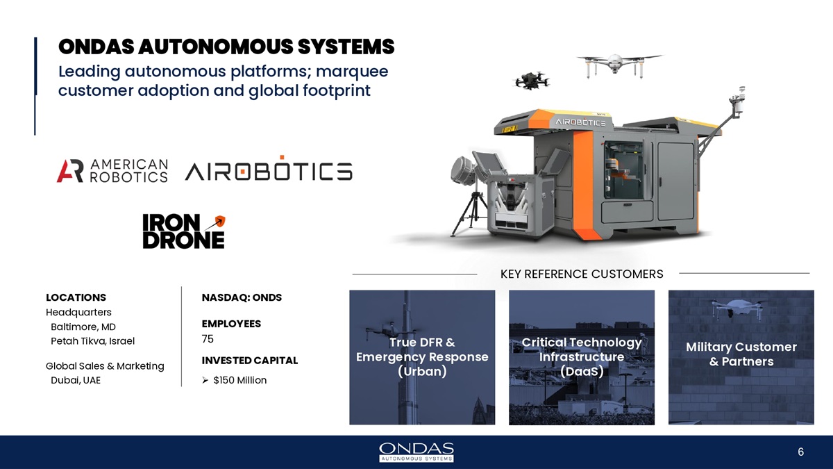 KEY REFERE N CE C USTO M ERS ONDAS AUTON O MO U S SYSTEMS Leading autonomous platforms; marquee customer adoption and global footprint NA S D A Q: O NDS EMPLOYEES 75 I NV E S TED CA P I TAL » $ 1 50 Mi l li on LOCATIONS Headquarters B al t i mo r e, MD P e t ah T i k v a, I s r ael G l obal Sales & M a r k e t i ng Dub a i , UAE Mi l i t a r y Cus t o m er & Partfiers 6 Criti c al T e c hf i o l o gy Ififrastructure (DaaS) T r u e DFR & Emer g ef i c y Respofise (Urbafi)