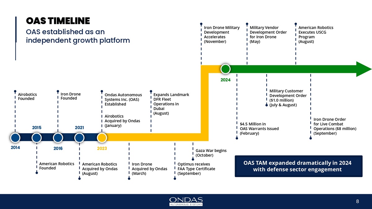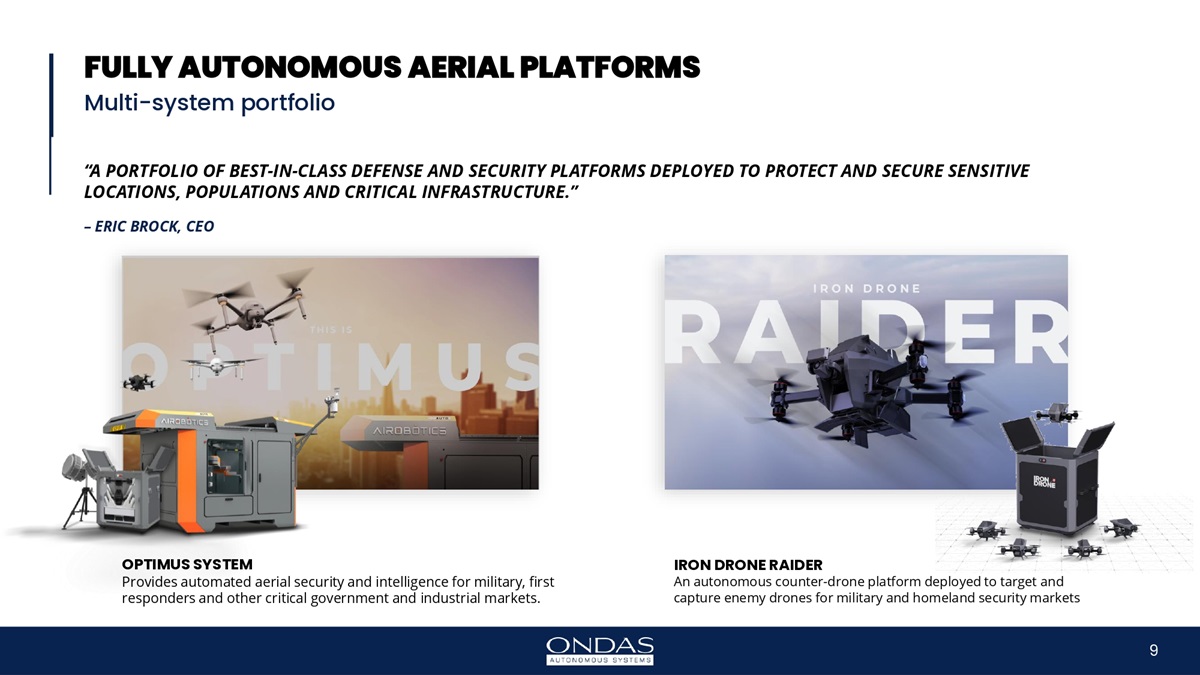 OAS T I MELI NE OAS established as an independent growth platform 2 0 14 2 0 16 2 0 15 20 2 1 2 0 24 Air o b o t ics Founded American Robotics Founded 2 0 23 Ondas Autonomous Systems Inc. (OAS) Established Airobotics Acquired by Ondas (January) I r on Dr o n e Founded Iron Drone Acquired by Ondas (March) E x p an d s Lan d m ark DFR Fleet Operations in Dubai (August) Iron Drone Military Development Accelerates (November) $4.5 Million in O A S W ar r an t s I ss u ed (February) Military Customer Development Order ($1.0 million) ( J u ly & A u gus t ) Military Vendor Development Order for Iron Drone (May) American Robotics Executes USCG Program (August) Iron Drone Order for Live Combat Operations ($8 million) (September) 8 American Robotics Acquired by Ondas (August) Gaza War begins (October) Optimus receives FAA T y p e C e r t if ic a t e (September) OAS TAM expanded dramatically in 2024 with defense sector engagement