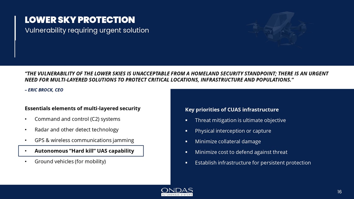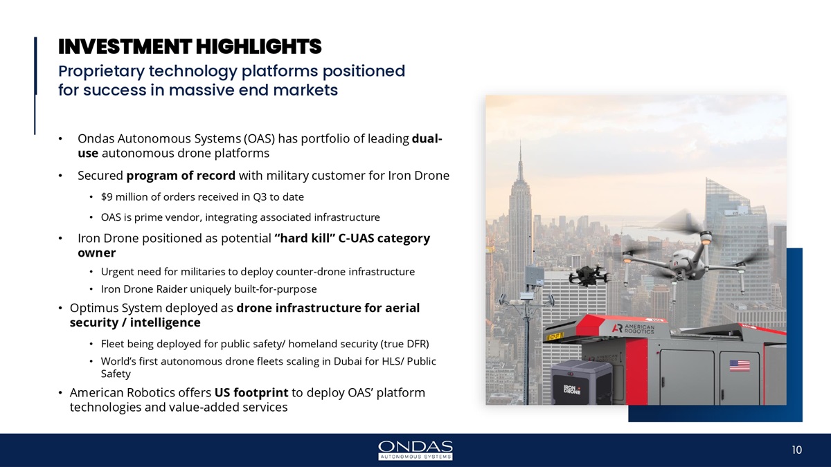 “A PORTFOLIO OF BEST - IN - CLASS DEFENSE AND SECURITY PLATFORMS DEPLOYED TO PROTECT AND SECURE SENSITIVE LOCATIONS, POPULATIONS AND CRITICAL INFRASTRUCTURE.” – ERIC BROCK, CEO 9 I RON D RONE RA I D ER An autonomous counter - drone platform deployed to target and capture enemy drones for military and homeland security markets O P TI MU S S YS TEM Provides automated aerial security and intelligence for military, first responders and other critical government and industrial markets. F U LLY AUT O NOM O US AERIAL PLATF O RMS Multi - system portfolio