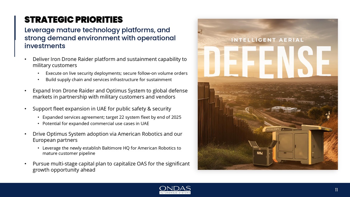 INVEST MENT H I GHLIGHTS Proprietary technology platforms positioned for success in massive end markets 10 • Ondas Autonomous Systems (OAS) has portfolio of leading dual - use autonomous drone platforms • Secured program of record with military customer for Iron Drone • $9 million of orders received in Q3 to date • OAS is prime vendor, integrating associated infrastructure • I r o n D r o n e p o s i ti o n e d a s p o te n tial “ha r d k i l l ” C - U AS ca t eg o ry owner • Urgent need for militaries to deploy counter - drone infrastructure • Iron Drone Raider uniquely built - for - purpose • Optimus System deployed as drone infrastructure for aerial se c uri t y / i n tel l i gence • Fleet being deployed for public safety/ homeland security (true DFR) • World’s first autonomous drone fleets scaling in Dubai for HLS/ Public Safety • American Robotics offers US footprint to deploy OAS’ platform technologies and value - added services