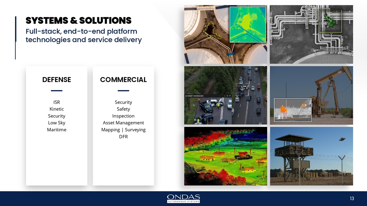 SYSTEMS & SOL U TI ONS Full - stack, end - to - end platform technologies and service delivery DEFENSE ISR Kinetic Security Low Sky Mar i t ime COMMERCIAL Security Safety I n spe c t i o n Asset Management Mapping | Surveying DFR 13