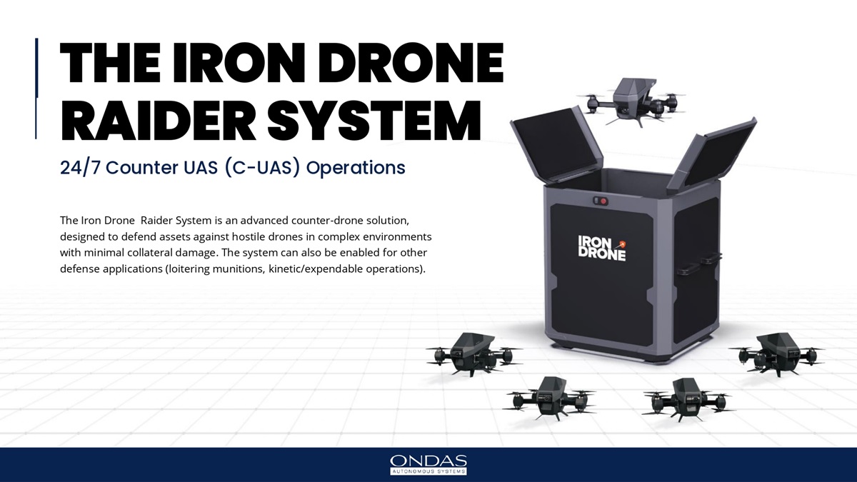 THE IRON DR O NE RAI D ER SYSTEM 24/7 Cou n ter UAS ( C - U A S) Oper a tions The Iron Drone Raider System is an advanced counter - drone solution, designed to defend assets against hostile drones in complex environments with minimal collateral damage. The system can also be enabled for other defense applications (loitering munitions, kinetic/expendable operations).