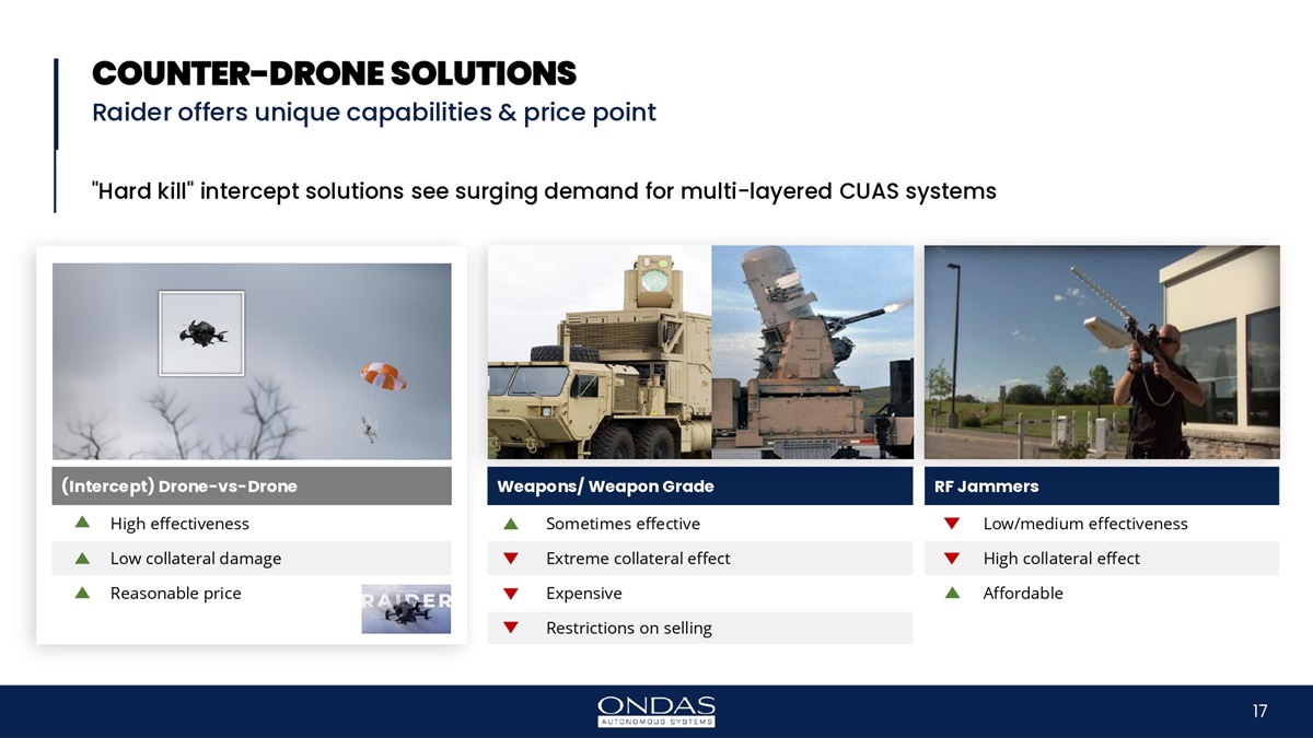 L O WER SKY PROTEC TI ON Vulnerability requiring urgent solution 16 Essentials elements of multi - layered security • Command and control (C2) systems • Radar and other detect technology • GP S & wi r e l e s s c o m m un i c a tio ns j amm i ng • Autonomous “Hard kill” UAS capability • Ground vehicles (for mobility) “THE VULNERABILITY OF THE LOWER SKIES IS UNACCEPTABLE FROM A HOMELAND SECURITY STANDPOINT; THERE IS AN URGENT NEED FOR MULTI - LAYERED SOLUTIONS TO PROTECT CRITICAL LOCATIONS, INFRASTRUCTURE AND POPULATIONS.” – ERIC BROCK, CEO K e y prio ri t ie s o f C U AS i n f r ast ructu r e ▪ Threat mitigation is ultimate objective ▪ Physical interception or capture ▪ Minimize collateral damage ▪ Minimize cost to defend against threat ▪ Establish infrastructure for persistent protection