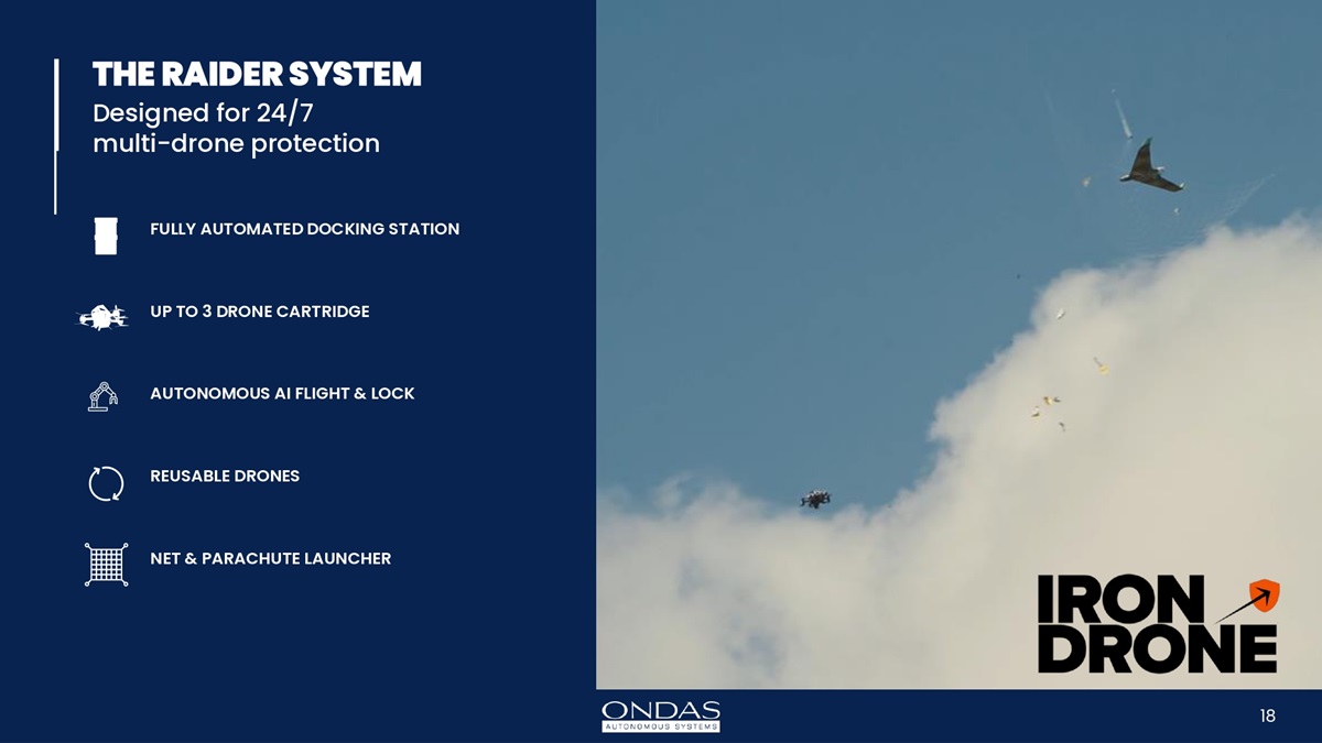 W eapo n s/ Wea po n Grade Sometimes effective Extreme collateral effect Expensive Restrictions on selling R F Jammers Low/medium effectiveness High collateral effect Affordable (I n tercep t ) Dro n e - vs - Dro n e High effectiveness Low collateral damage Reasonable price "Hard kill" intercept solutions see surging demand for multi - layered CUAS systems 17 COUNTER - DR O NE SO L UTIONS Raider offers unique capabilities & price point