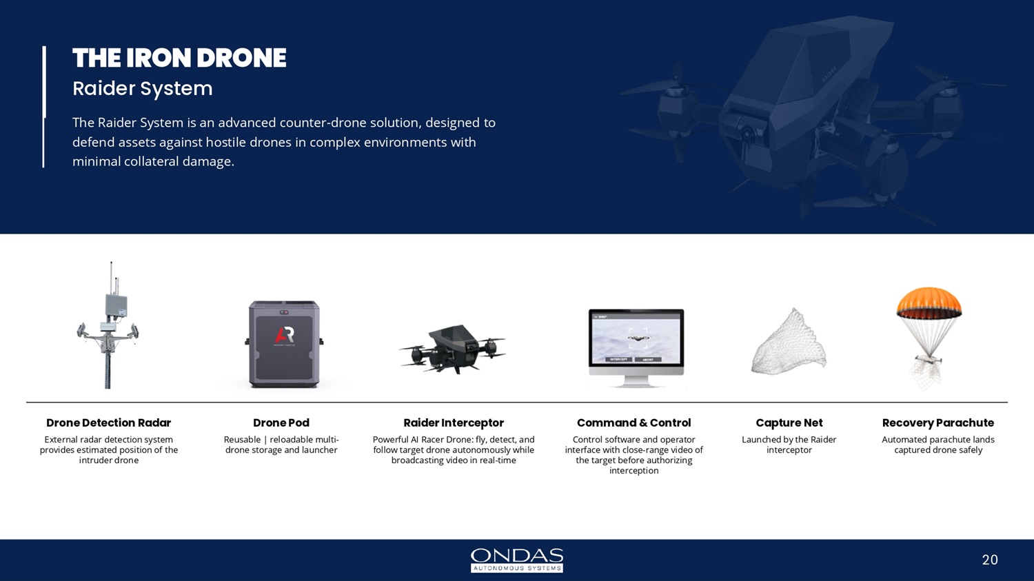 TH E I RON DR O NE Ra i d e r Syst e m The Raider System is an advanced counter - drone solution, designed to defend assets against hostile drones in complex environments with minimal collateral damage. D r one Po d Reusable | reloadable multi - drone storage and launcher D r one D etect i on R a d a r External radar detection system provides estimated position of the intruder drone Comm a nd & Cont r ol Control software and operator interface with close - range video of the target before authorizing interception R a i d er I nt er c e p t or Powerful AI Racer Drone: fly, detect, and follow target drone autonomously while broadcasting video in real - time Ca p t u r e Net Launched by the Raider interceptor Re c ove r y Par a chute Automated parachute lands captured drone safely 20