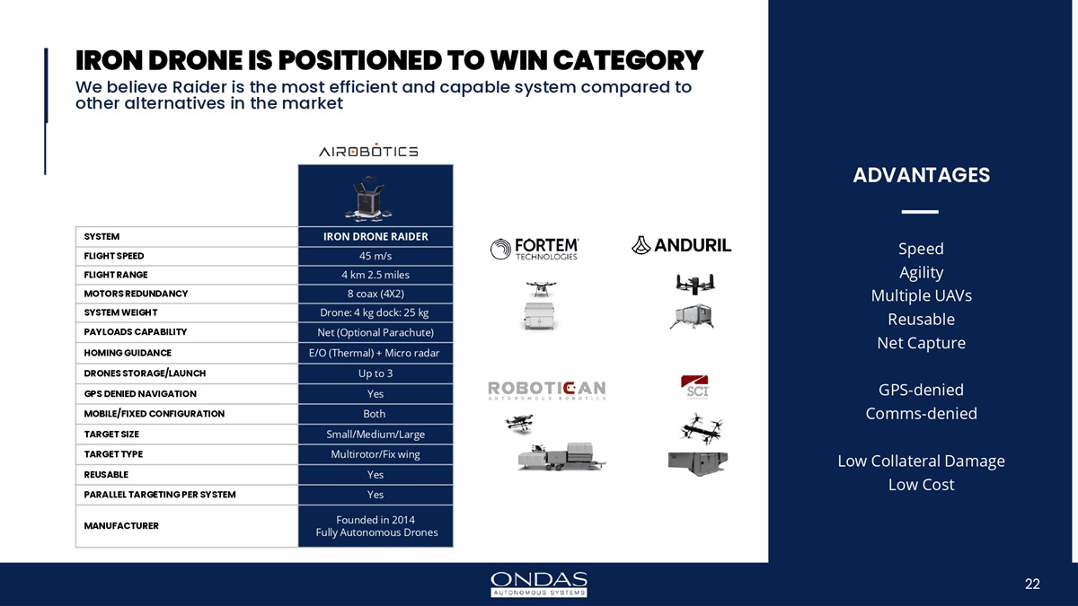 I R ON DR ONE R AI D ER SYSTEM 45 m/s FLIGHT S PE E D 4 km 2.5 miles FLIGHT R AN GE 8 coax (4X2) MOTORS R E D UN D AN CY Drone: 4 kg dock: 25 kg S YST E M W E IGHT Net (Optional Parachute) PAYLO A DS C A PA B ILITY E/O (Thermal) + Micro radar HOMI N G G U ID AN CE Up to 3 DRO NE S S TOR A G E/ L AUN CH Yes GPS D EN I E D NA VIG A TION Both MOBIL E / FIX E D C O N FIG U R A TION Small/Medium/Large T A RG E T S IZE Mul t ir o t o r / F i x w ing T A RG E T TYPE Yes REUSABLE Yes PAR A LLEL T A RG E TI N G PER S YST E M Founded in 2014 Fully Autonomous Drones MANUFACTURER We believe Raider is the most efficient and capable system compared to other alternatives in the market IRON DRONE IS POSITIONED TO WIN CATEGORY ADVANTAGES Spe e d Agility Mu l tip l e U A V s Reusable Net Capture GPS - denied Co m m s - d e n i e d Low Collateral Damage Low Cost 22