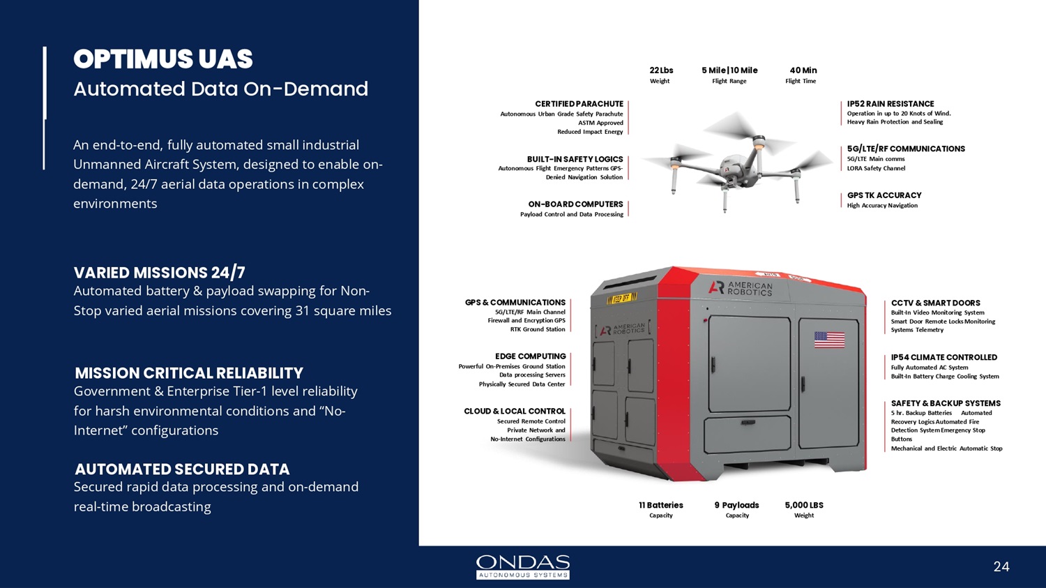 C ER TI F IED P A R A C H U T E Autonomous Urban Grade Safety Parachute ASTM Approved Reduced Impact Energy B UIL T - IN S A F ETY L O G I C S Autonomous Flight Emergency Patterns GPS - Denied Navigation Solution ON - B O A RD C O M P U T E R S Payload Control and Data Processing G PS & C O MM U N I C A T I O N S 5G/LTE/RF Main Channel F i r ew a l l and E n c ryp ti on GPS RTK Ground Station E D G E C O M P U T I N G Powerful On - Premises Ground Station Data processing Servers Physically Secured Data Center C LOUD & LO C AL C O N T R O L Secured Remote Control Private Network and No - Internet Configurations IP5 2 R AIN R E S I S T A N C E Operation in up to 20 Knots of Wind. Heavy Rain Protection and Sealing 5 G / LTE/ RF C O MM U N I C A T I O N S 5G/LTE Main comms LORA Safety Channel G PS TK A CC U R A C Y High Accuracy Navigation CC TV & S MAR T D OO R S Built - In Video Monitoring System Smart D oor Re mo t e L ocks Mon it or i ng Systems Telemetry IP5 4 C LIMATE C O N T R O LL E D Fully Automated AC System Built - In Battery Charge Cooling System S A F ETY & B A C K UP S Y S T E M S 5 hr. Ba ck up Ba tte r ie s A u t o m a te d Rec ov e ry L og ic s A u t o m a te d F i re D etecti on Sys te m E m e rg e n c y S t op Buttons Mechanical and Electric Automatic Stop 4 0 M i n F li ght T i m e 22 L b s Weight 5 M i le | 10 M il e Flight Range 5 , 000 L B S Weight 11 B a tte r i e s Capacity 9 Payloads Capacity OPTIMUS UAS Aut o ma t e d Data On - Dem and An end - to - end, fully automated small industrial Unmanned Aircraft System, designed to enable on - demand, 24/7 aerial data operations in complex environments M I SS I ON CRITI CAL RE L I ABIL I TY Government & Enterprise Tier - 1 level reliability for harsh environmental conditions and “No - Internet” configurations 24 AUTOMATED SECURED DATA Secured rapid data processing and on - demand real - time broadcasting V A R I ED MISS I ONS 24/7 Automated battery & payload swapping for Non - Stop varied aerial missions covering 31 square miles