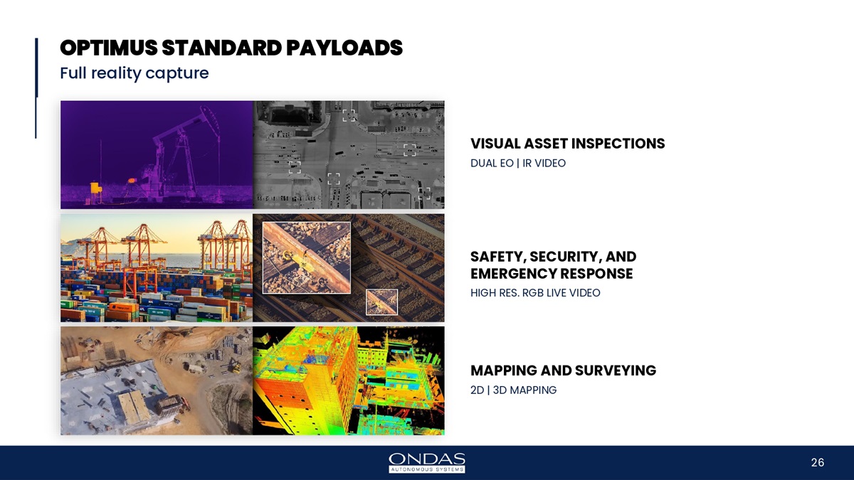 VISUAL ASSE T INSPECTIONS D U A L EO | I R V I DEO 26 SAF ET Y, SECUR ITY, AND EMERGENCY RES PO NSE HIG H R E S . RG B LI V E V I DEO MAPPING AND SU RVEYING 2 D | 3D M A PPI N G OPTIMUS ST ANDARD PAYLOADS F u ll r e a l it y ca p ture