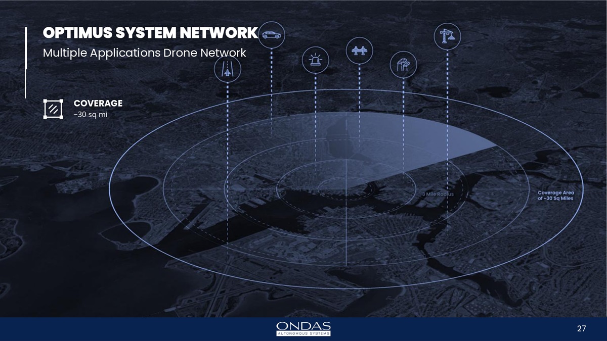 Multiple A p plic a ti ons Drone N etwor k O P TIMUS SYSTEM NETW O RK C O V E R A GE ~30 sq mi 27