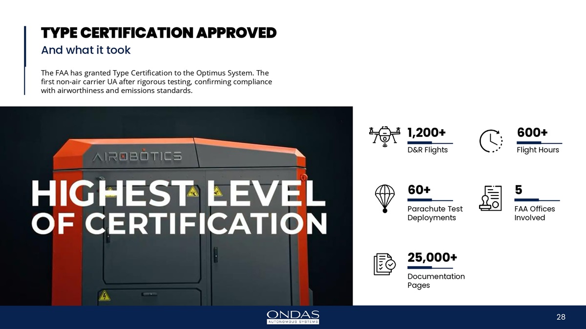 TYPE C E RTIFI CAT I ON APPR O VED And what it to ok 1,200+ D & R Fl i g hts 60+ P a r a c hu t e Test Deployments 5 F A A Off i ces Involved The FAA has granted Type Certification to the Optimus System. The first non - air carrier UA after rigorous testing, confirming compliance with airworthiness and emissions standards. 6 0 0 + F li g ht Hou r s 25, 0 0 0+ D o c um en t a t i on Pages 28