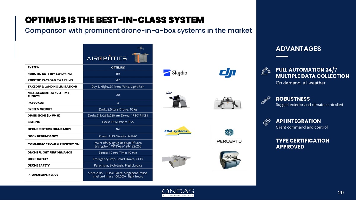 OPTIMUS SYSTEM YES ROBO T IC B A TT E RY S W A PPI N G YES RO B OTIC P A YLO A D S WA PPI N G Day & Night, 25 knots Wind, Light Rain TAKEOFF & LANDING LIMITATIONS 20 M A X. SE Q UEN TI A L F U LL TIME FLIGHTS 4 PAYLOADS Dock: 2.5 tons Drone: 10 kg S YST E M W E IGHT Dock: 215x265x220 cm Drone: 178X178X38 DIM ENS IO N S ( L ù W ù H) Dock: IP56 Drone: IP55 SEALING No DRO N E MOTOR RED U N D A N C Y P o we r : U P S C li ma te: Full A C DOCK R E D UN D AN CY Main: Rf/3g/4g/5g Backup: Rf Lora Encryption: VPN/Aes - 128/192/256 COMM UN IC A TI O N S & EN CRYPTION Speed: 12 m/s Time: 40 min DRO N E FLIGHT PERFORM AN CE Emergency Stop, Smart Doors, CCTV DOCK SA F E TY Parachute, Stob - Light, Flight Logics DRO N E SA F E TY Since 2015 , Dubai Police, Singapore Police, Intel and more 100,000+ flight hours P R OVEN E XP E RI EN CE OPTIMUS I S THE BES T - IN - CLASS SYSTEM Comparison with prominent drone - in - a - box systems in the market ADVANTAGES F U LL A U TOM A T ION 24/7 M U LT I PLE DA T A COLLECT I ON On demand, all weather ROBUSTNESS Rugged exterior and climate - controlled API I NT E G R A T ION Client command and control TYPE C ERT I FI C A TIO N APPROVED 29
