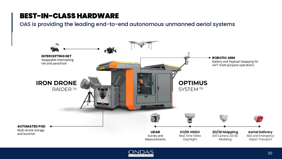 BES T - IN - CLASS HARDWARE OAS is providing the leading end - to - end autonomous unmanned aerial systems I N T ERCE P T I N G NET Swappable intercepting net and parachute AU T O M ATED P OD Mult i - dr one s t ora g e and launcher 30 R O B O T IC ARM Battery and Payload Swapping for 24/7 multi - purpose operations LIDAR Survey and M e a s ur e me n t s EO/IR V I DE O Real - Time Video Day/Night 2 D/ 3 D M a pp ing Still Camera 2D/3D Modeling A e r i a l De l i v e r y A ED an d Em e rg e nc y Object Transport