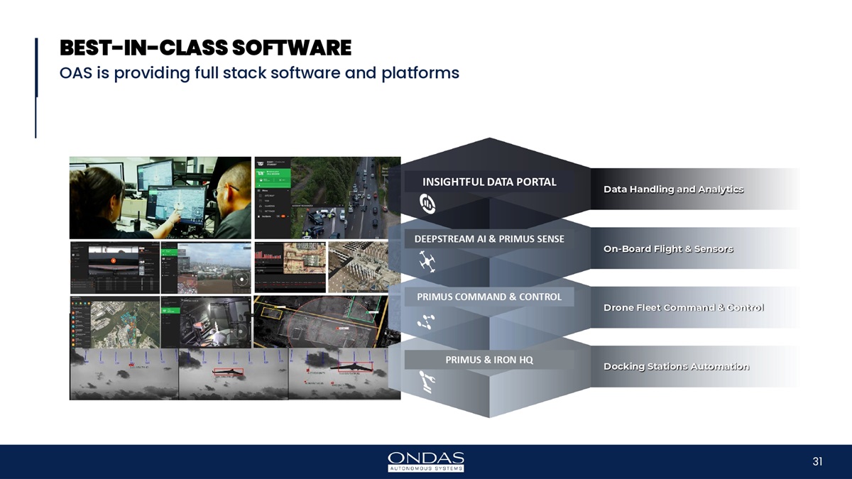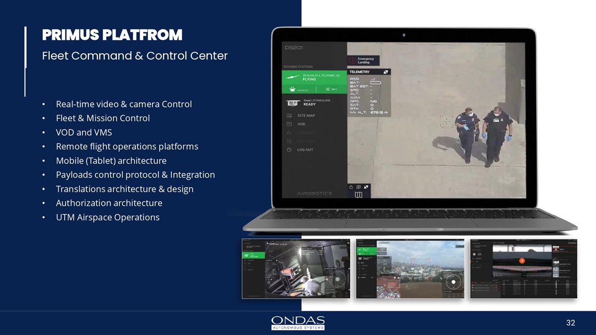 D o cki ng S t a t i o ns A u t o m a t i o n D ro ne F l ee t C o mm a nd & C o ntro l O n - B o a rd F l i g ht & Se ns o rs D a t a H a nd li ng a nd A na l y t i cs 31 BES T - IN - CLASS SO F TWARE OAS is providing full stack software and platforms I NS IGHTFUL D AT A P O R T AL PRIMUS COMMAND & CONTROL DEEPSTREAM AI & PRIMUS SENSE PRIMUS & IRON HQ