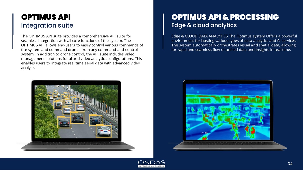 OPTIMUS A P I & P R O C E S S I N G E d ge & cl o ud ana l ytics Edge & CLOUD DATA ANALYTICS The Optimus system Offers a powerful environment for hosting various types of data analytics and AI services. The system automatically orchestrates visual and spatial data, allowing for rapid and seamless flow of unified data and Insights in real time. 34 Integration suite The OPTIMUS API suite provides a comprehensive API suite for seamless integration with all core functions of the system. The OPTIMUS API allows end - users to easily control various commands of the system and command drones from any command - and - control system. In addition to drone control, the API suite includes video management solutions for ai and video analytics configurations. This enables users to integrate real time aerial data with advanced video analysis. OPTIMUS A P I