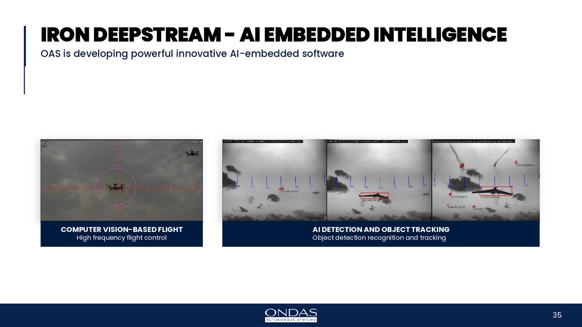 C OMPUTE R V I S I ON - BA S ED FL I G HT Hi g h fr e q u e n c y fli g h t c o n trol AI DET E C TIO N AND OBJE C T T R ACKI N G Object detection recognition and tracking 35 IR O N D E EPSTREAM - AI EMBEDD E D INT E LLIG E NCE OAS is developing powerful innovative AI - embedded software