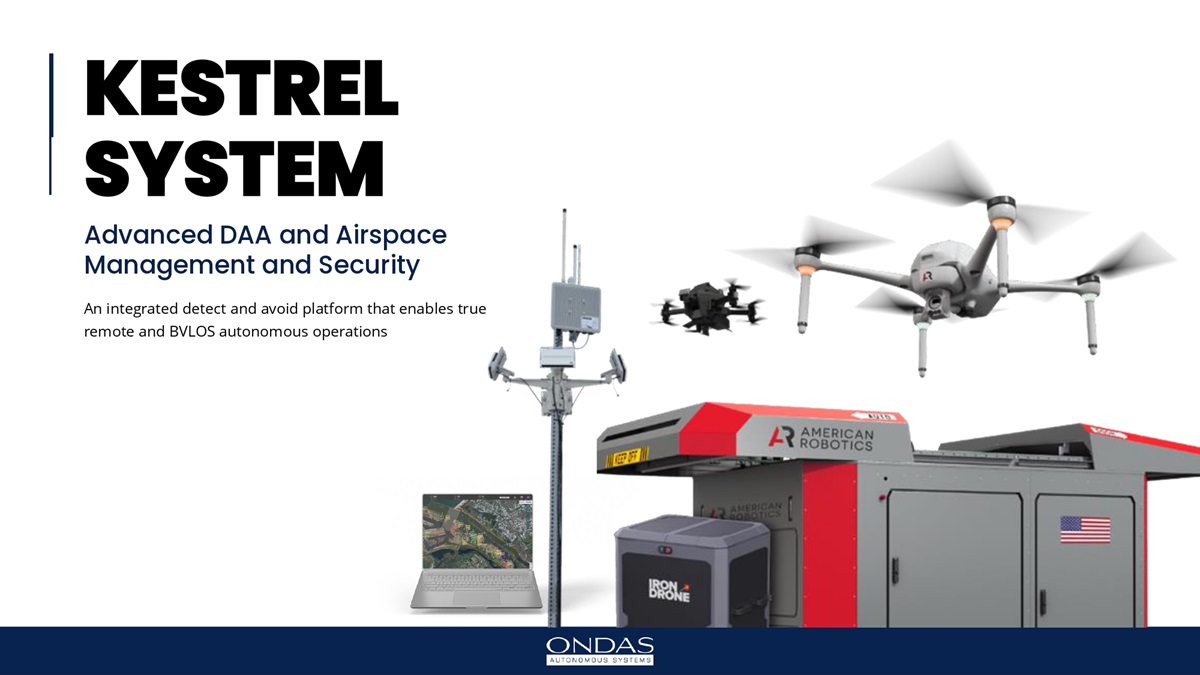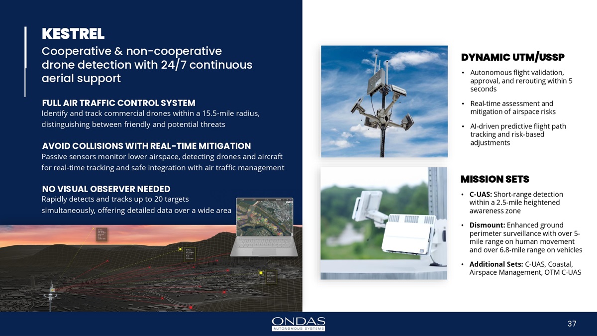 DYNA M IC UTM/US S P • Autonomous flight validation, approval, and rerouting within 5 seconds • R e a l - t i m e assess m e n t a n d mitigation of airspace risks • AI - driven predictive flight path tracking and risk - based adjustments MIS S IO N SETS • C - U A S : S ho r t - r a n g e d e t e ct i o n within a 2.5 - mile heightened awareness zone • Dismount: Enhanced ground perimeter surveillance with over 5 - mile range on human movement and over 6.8 - mile range on vehicles • Additional Sets: C - UAS, Coastal, Airspace Management, OTM C - UAS NO V I S U A L OBS E R V E R N E E D E D Rapidly detects and tracks up to 20 targets simultaneously, offering detailed data over a wide area F U LL AIR TR A FFI C CONT R OL S Y ST E M Identify and track commercial drones within a 15.5 - mile radius, distinguishing between friendly and potential threats A V OI D COLL I S I O NS WI TH R E A L - TIME MIT I G A TIO N Passive sensors monitor lower airspace, detecting drones and aircraft for real - time tracking and safe integration with air traffic management KESTREL Cooperative & non - cooperative drone detection with 24/7 continuous aerial support 37