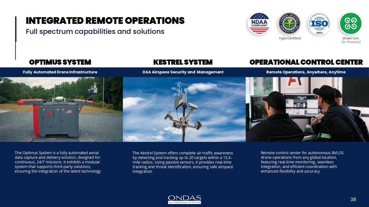 The Kestrel System offers complete air traffic awareness by detecting and tracking up to 20 targets within a 15.5 - mile radius. Using passive sensors, it provides real - time tracking and threat identification, ensuring safe airspace integration Fully Automated Drone Infrastructure Remote Operations, Anywhere, Anytime The Optimus System is a fully automated aerial data capture and delivery solution, designed for continuous, 24/7 missions. It exhibits a modular system that supports third - party solutions, ensuring the integration of the latest technology Remote control center for autonomous BVLOS drone operations from any global location, featuring real - time monitoring, seamless integration, and efficient coordination with enhanced flexibility and accuracy DAA Airspace Security and Management O P T I MU S S Y ST E M K E ST R EL SYST E M O P E R AT I ONAL CONT R OL CEN T ER G r e e fi U AS (In - Process) 38 T y p e C e rtifi e d INT EGRATED REMOTE OPERATIONS Full spectrum capabilities and solutions