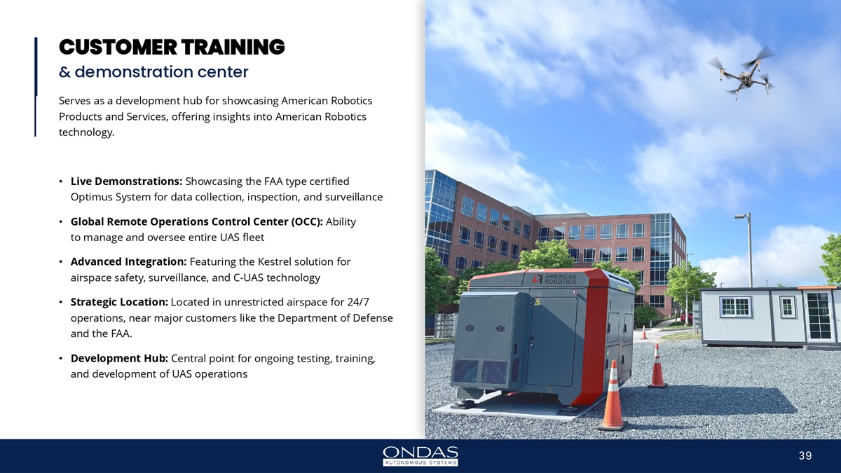 & demonstration center Serves as a development hub for showcasing American Robotics Products and Services, offering insights into American Robotics technology. CUSTOMER TRAIN I NG • Live Demonstrations: Showcasing the FAA type certified Optimus System for data collection, inspection, and surveillance • Global Remote Operations Control Center (OCC): Ability to manage and oversee entire UAS fleet • Advanced Integration: Featuring the Kestrel solution for airspace safety, surveillance, and C - UAS technology • Strategic Location: Located in unrestricted airspace for 24/7 operations, near major customers like the Department of Defense and the FAA. • Development Hub: Central point for ongoing testing, training, an d d e ve l o p me n t o f U A S o pe r ati o n s 39