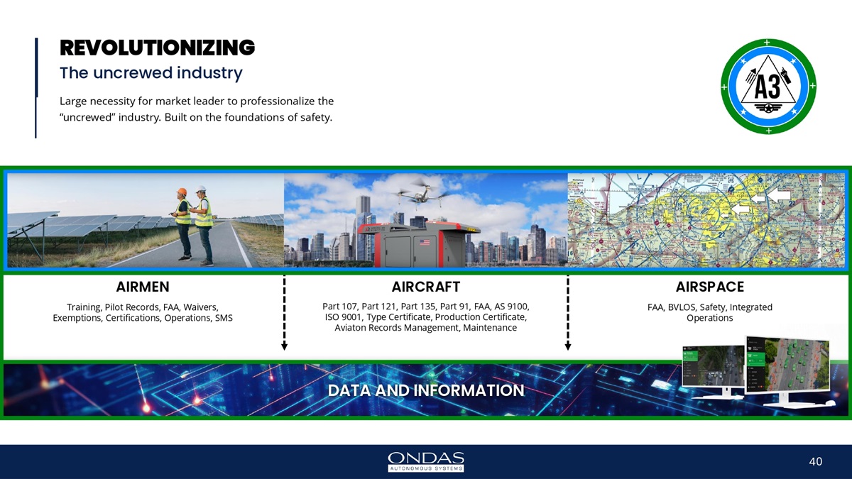 D ATA A N D INF ORMAT I ON The u n cr e w e d industr y Large necessity for market leader to professionalize the “uncrewed” industry. Built on the foundations of safety. REVOL UTIONIZ ING AIRMEN Training, Pilot Records, FAA, Waivers, Exemptions, Certifications, Operations, SMS AIRCRAFT Par t 107 , Par t 121 , Par t 135 , Par t 91 , F A A, A S 9100 , ISO 9001, Type Certificate, Production Certificate, Aviaton Records Management, Maintenance AIRSPACE FAA, BVLOS, Safety, Integrated Operations 40