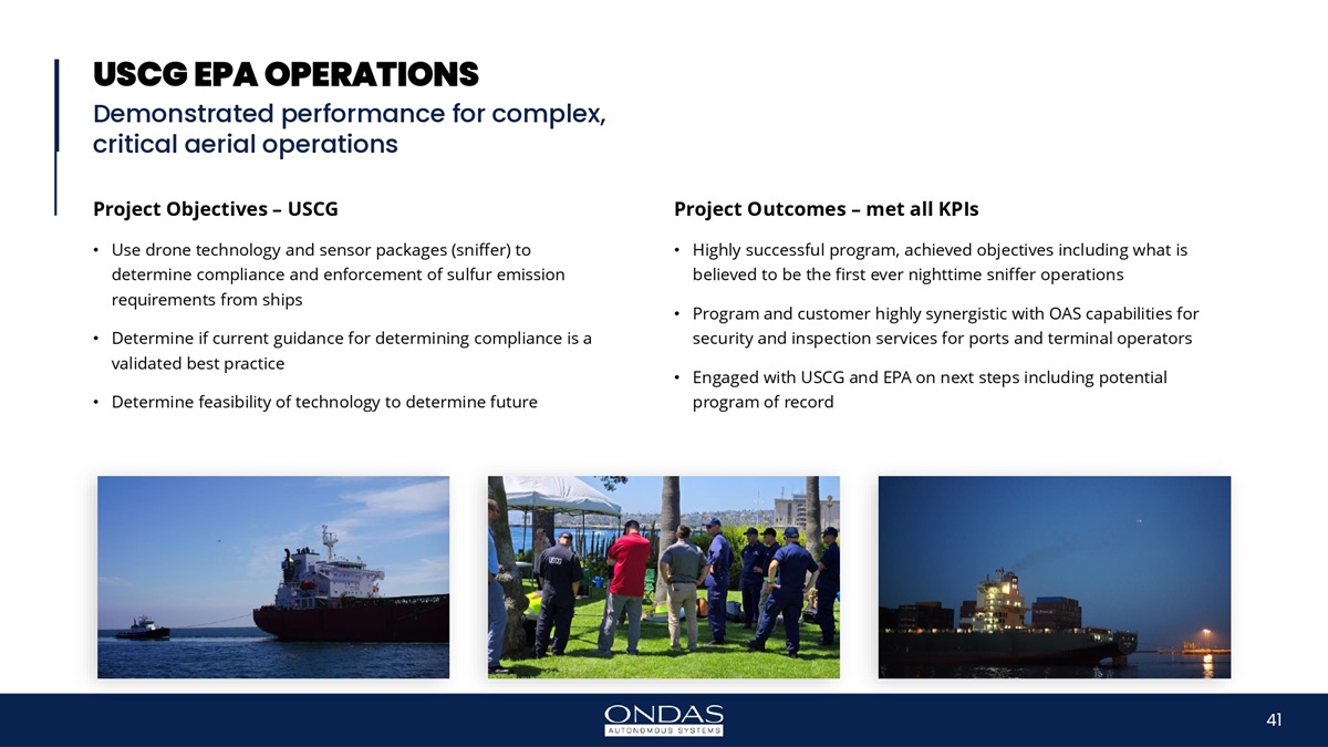 USCG E PA O PERATIONS Dem o nstra t e d p e r f o r ma nce fo r com p l e x, critical aerial operations P r o jec t Objecti ves – U S C G • Use drone technology and sensor packages (sniffer) to determine compliance and enforcement of sulfur emission requirements from ships • Determine if current guidance for determining compliance is a validated best practice • Determine feasibility of technology to determine future P r o jec t Outcom e s – met all KPIs • Highly successful program, achieved objectives including what is believed to be the first ever nighttime sniffer operations • Program and customer highly synergistic with OAS capabilities for security and inspection services for ports and terminal operators • Engaged with USCG and EPA on next steps including potential program of record 41