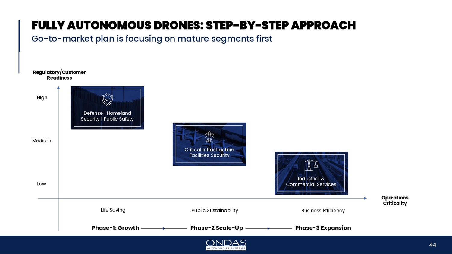 1.1 1.3 1.5 1.8 2.1 2.5 2.9 3.5 2 0 23 2 0 24 2 0 25 2 0 26 2 0 27 2 0 28 2 0 29 2 0 3 0 https:// www.fortunebusinessinsights.com/drone - in - a - box - market - 108470 O P T I MU S D RO N E - I N – A - BOX M A RK E T D e f e n s e | H o m e l and S e c ur i ty | Pu b li c Sa f e ty Industrial & Co m m e r c i a l S e r v i c e s Critical Infrastructure Facilities Security 1.9 2.4 3 .0 3.9 5.0 6.3 8.1 1 0 .3 I R O N DR O N E R A I DE R CO U N T E R M A RKE T 2 0 23 2 0 24 2 0 25 2 0 26 2 0 27 2 0 28 2 0 29 2 0 30 https:// www.grandviewresearch.com/industry - analysis/anti - drone - market OAS STRONG PRES E NCE IN KEY G L OBAL MARKETS From governmental to commercial customers and applications 43
