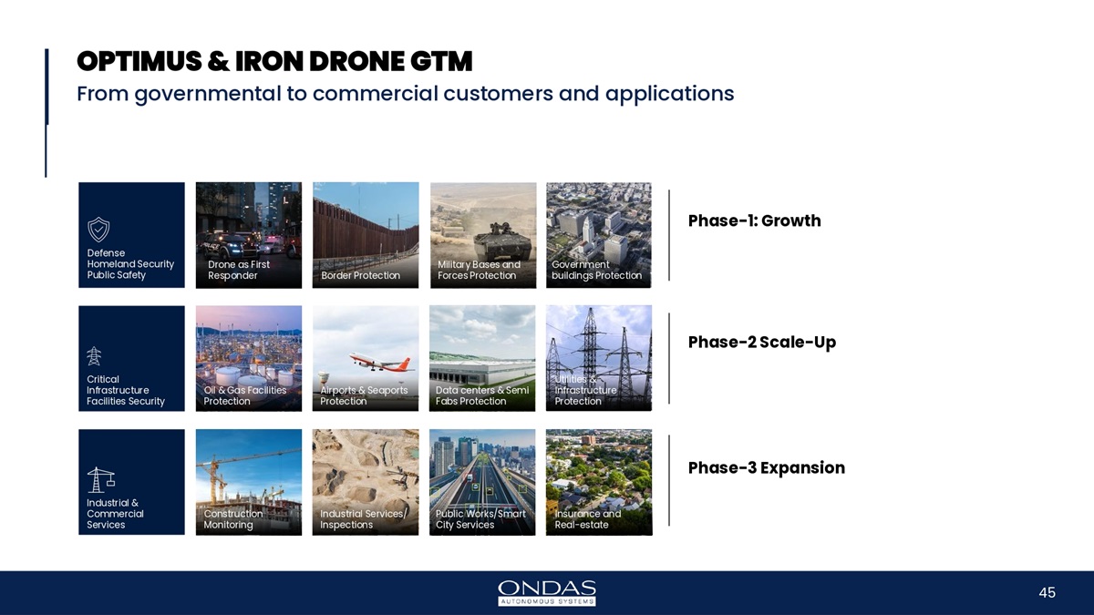 Pha s e - 1: Growt h I ndus t ri a l & C omm e rc i a l Services Pha s e - 2 Scal e - Up Pha s e - 3 Ex p a nsi o n D ron e a s F i rst Responder Bor d e r P ro t e c t i on M ili t a ry B a se s a nd F orc e s P ro t e c t i on Government b u i l d i ngs Pro t e c t i on O i l & G a s F a c ili t i e s Protection A i rp or t s & S e a p or t s Protection D a t a c e n t e rs & S e mi F a b s P ro t e c t i on Utilities & I nfr a s t ruc t ure Protection C on s t ruc t i on Monitoring I ndus t ri a l S e rv i c e s/ Inspections I nsu r a nc e a nd Real - estate P ub l i c W ork s/S m a rt City Services Critical Infrastructure F a c ili t i e s Se c ur it y Defense H om e l a nd S e c ur it y Public Safety OPTIMUS & IRON DRONE GTM From governmental to commercial customers and applications 45