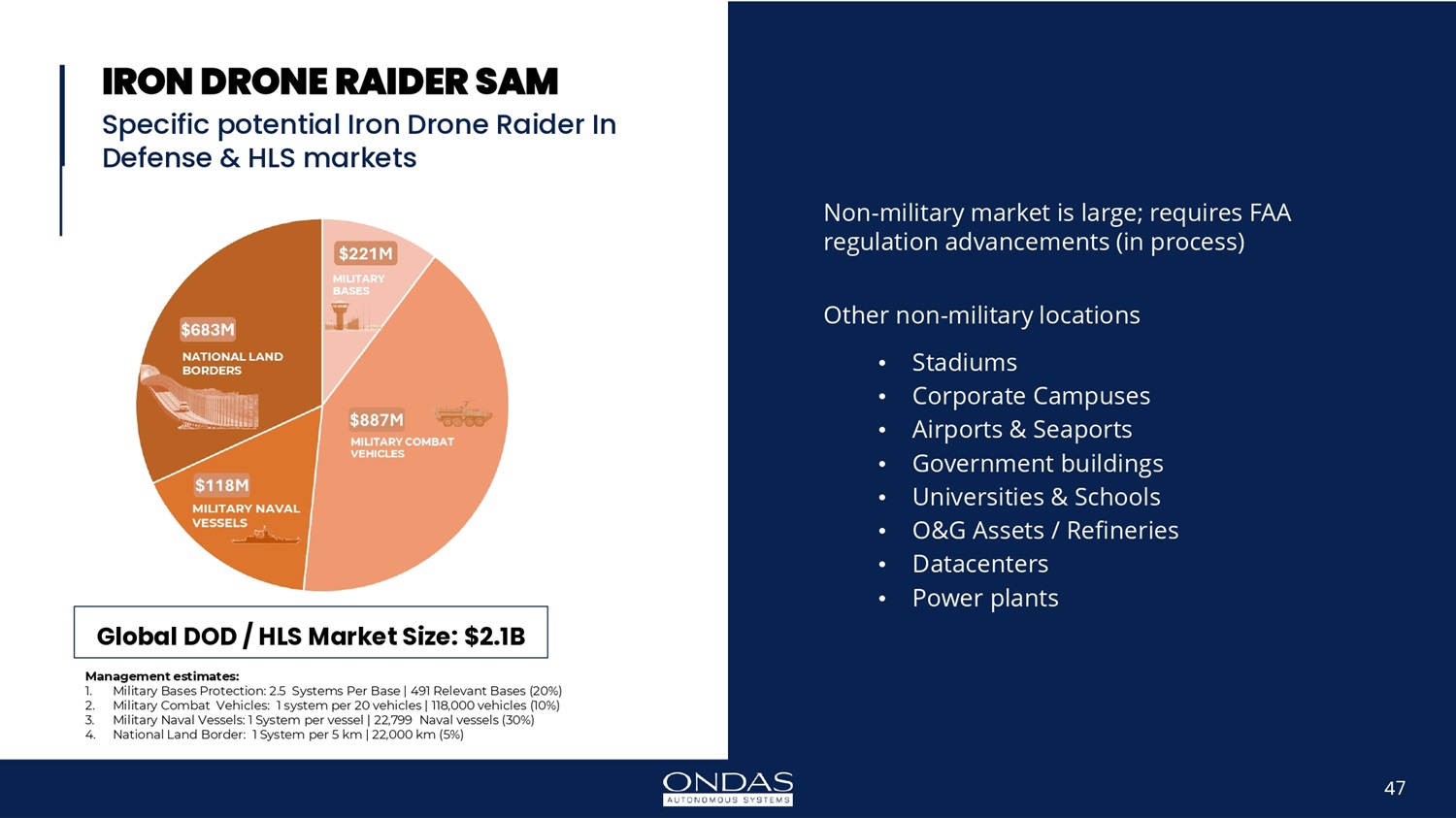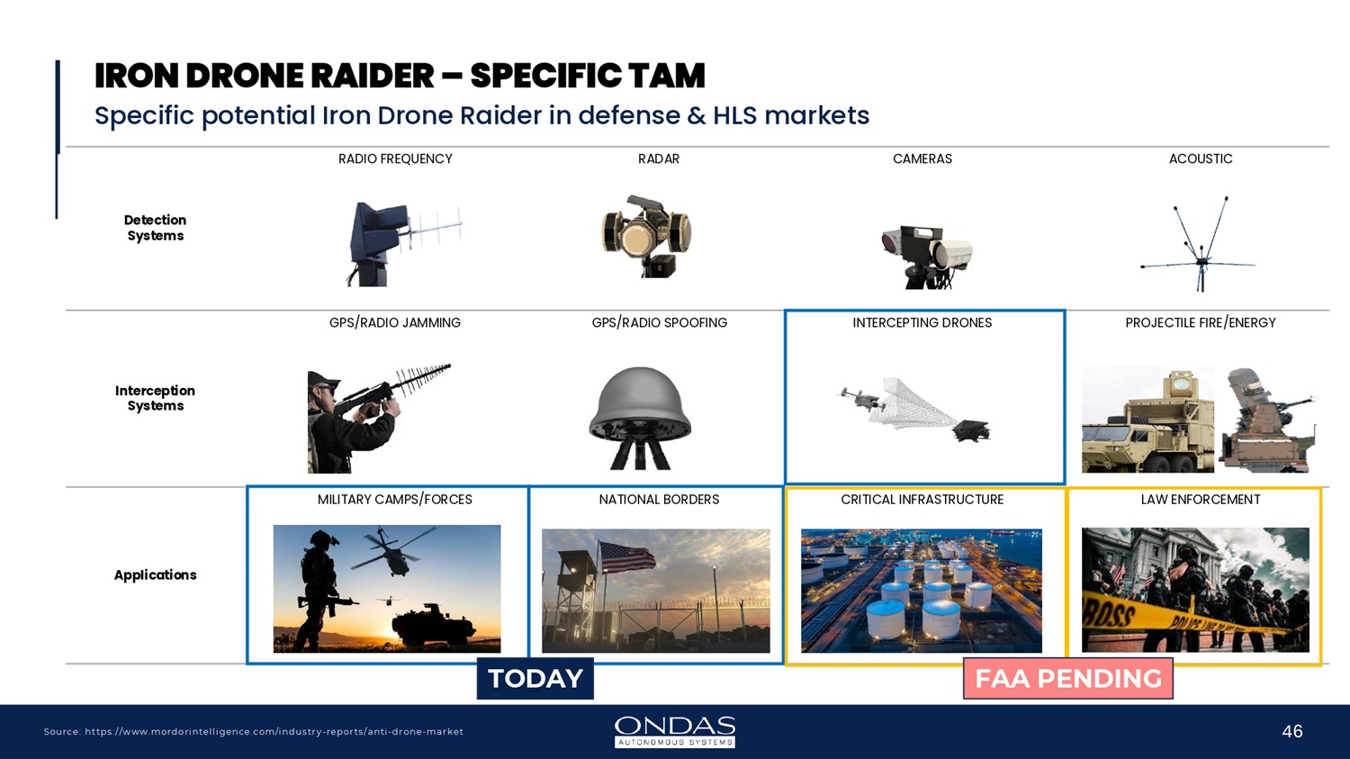 IRON DR O NE RAID E R – SPEC IFI C TAM 46 D e t e c t ion Systems Specific potential Iron Drone Raider in defense & HLS markets RADIO FREQUENCY RADAR CAMERAS A CO U ST I C PROJECTILE FIRE/ENERGY INTERCEPTING DRONES G P S/RAD I O JAMM I NG G P S/R A D I O S P OOF I NG In t e rc ep t ion Systems LAW ENFORCEMENT CRITICAL INFRASTRUCTURE NAT I ONAL BORD E RS M I L I TARY CAM P S/FORC E S Applications FAA PENDI N G TODAY Source: https: / / www. mordorintelligence. com/industry - reports/ a nti - drone - ma rket