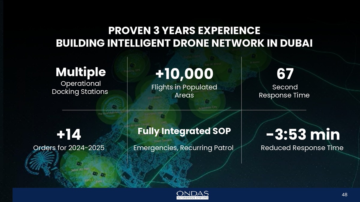 PR O VEN 3 YEARS EXPERIENCE BUILDING INTELLI G ENT DRONE NETWORK IN DUBAI +10,000 F ligh t s in P o pulat ed Areas Multiple Operational Docking Stati ons 67 Second Re s pon s e Ti m e +14 Orders for 2 0 2 4 - 2025 - 3:53 min Reduced Response Time Fully Integra ted SOP Emergencies, Recurring Patrol 48