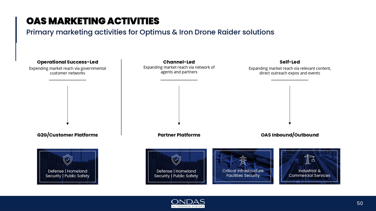 OAS MARKET I NG ACT I VITI ES Primary marketing activities for Optimus & Iron Drone Raider solutions O pe ra t i o n al S u cc e s s - L e d Expending market reach via governmental customer networks G 2 G / C u s t o me r P l at for ms Channel - Led Expanding market reach via network of agents and partners P ar t ne r P l at for ms Self - Led Expanding market reach via relevant content, direct outreach expos and events O A S I n bo un d/Outb o un d D e f e n s e | H o m e l and S e c ur i ty | Pu b li c Sa f e ty Critical Infrastructure Facilities Security Industrial & Co m m e r c i a l S e r v i c e s D e f e n s e | H o m e l and S e c ur i ty | Pu b li c Sa f e ty 50