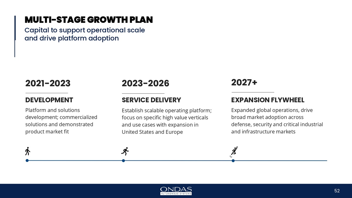 MU L T I - STAGE GR O WTH PLAN Ca p it al to suppo rt o p e r a t i onal sca l e and drive platform adoption 52 2021 - 2023 DEVELOPMENT Platform and solutions development; commercialized solutions and demonstrated product market fit 2023 - 2026 SER V I C E DELI V ERY Establish scalable operating platform; focus on specific high value verticals and use cases with expansion in United States and Europe 2 0 2 7 + EXPA N S I ON F L Y W H EEL Expanded global operations, drive broad market adoption across defense, security and critical industrial and infrastructure markets