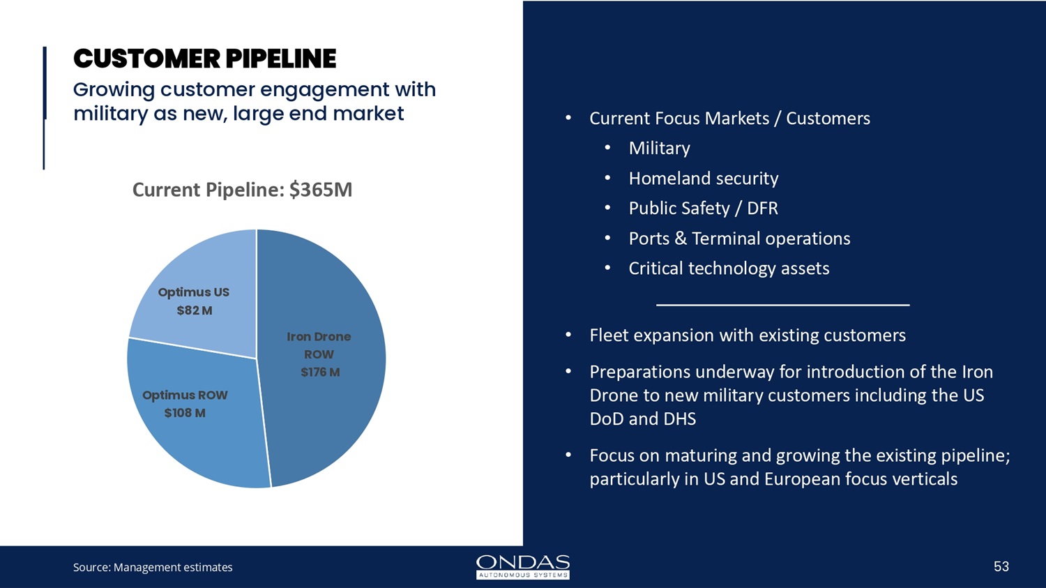 CUSTOMER PIPELI NE Growing customer engagement with military as new, large end market 53 • Current Focus Markets / Customers • Military • Homeland security • Public Safety / DFR • Ports & Terminal operations • Critical technology assets • Fleet expansion with existing customers • Preparations underway for introduction of the Iron Drone to new military customers including the US DoD and DHS • Focus on maturing and growing the existing pipeline; particularly in US and European focus verticals Ir on D r one ROW $ 1 76 M O p t i m us R O W $ 1 08 M O p t i m us US $ 8 2 M Current Pipeline: $365M Source: Management estimates
