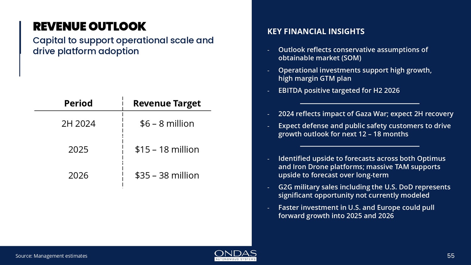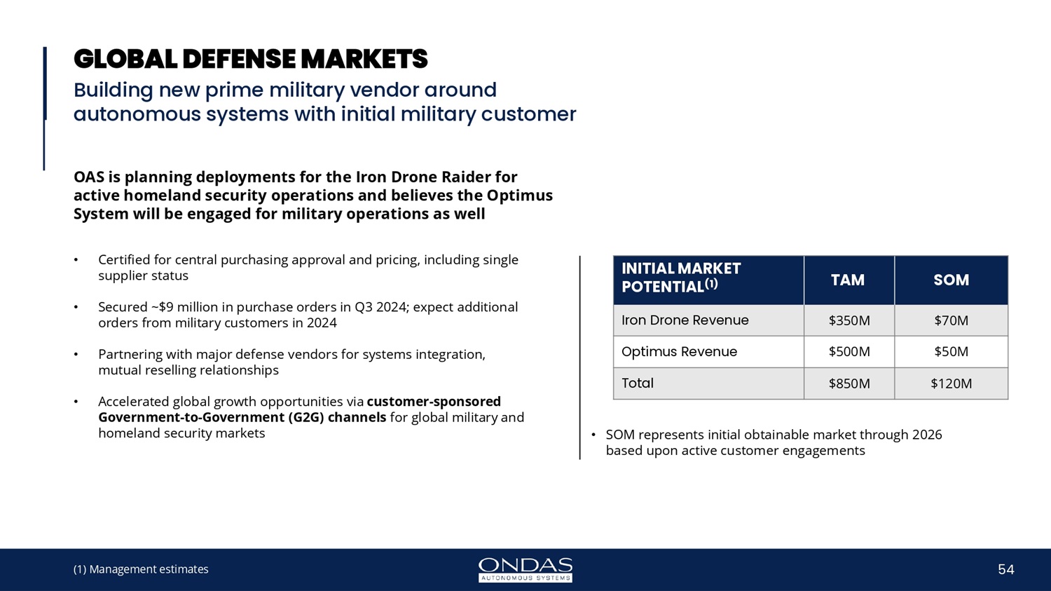 • Certified for central purchasing approval and pricing, including single supplier status • Secured ~$9 million in purchase orders in Q3 2024; expect additional orders from military customers in 2024 • Partnering with major defense vendors for systems integration, mutual reselling relationships • Accelerated global growth opportunities via customer - sponsored Government - to - Government (G2G) channels for global military and homeland security markets OAS is planning deployments for the Iron Drone Raider for active homeland security operations and believes the Optimus System will be engaged for military operations as well (1) Management estimates G L OBAL DEFE NSE MARKETS Building new prime military vendor around autonomous systems with initial military customer 54 SOM TAM INITIAL M A R KET POTENTIAL (1) $70M $350M Iron Drone Revenue $50M $500M Op t imus Revenue $120M $850M Total • SOM represents initial obtainable market through 2026 based upon active customer engagements