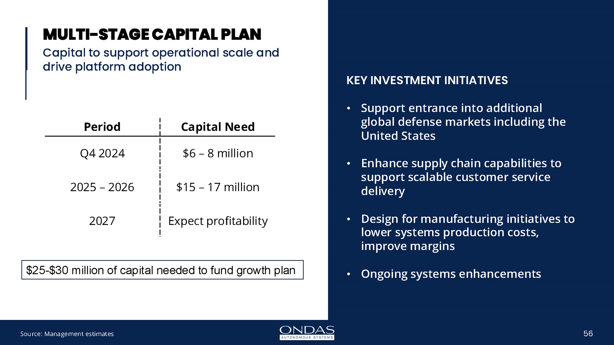 MU L T I - STAGE CAPI T AL P LAN Capital to support operational scale and drive platform adoption 56 Source: Management estimates KEY I NVEST M ENT INIT IAT I V E S • Support entrance into additional global defense markets including the United States • Enhance supply chain capabilities to support scalable customer service delivery • Design for manufacturing initiatives to lower systems production costs, improve margins • Ongoing systems enhancements Capital Need Period $6 – 8 million Q4 2024 $15 – 18 million 2025 – 2026 Expect profitability 2027 Expect to raise $25 – 30 million to fund growth plan