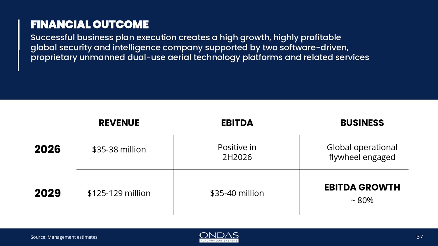 FINANC IAL O U TC OME Successful business plan execution creates a high growth, highly profitable global security and intelligence company supported by two software - driven, proprietary unmanned dual - use aerial technology platforms and related services Source: Management estimates 57 2 0 26 2 0 29 EB I TDA GROWTH ~ 80% Global operational flywheel engaged BUSINESS RE V ENUE $35 - 38 million $125 - 1 2 9 milli o n E B IT D A Positive in 2H2026 $35 - 40 million