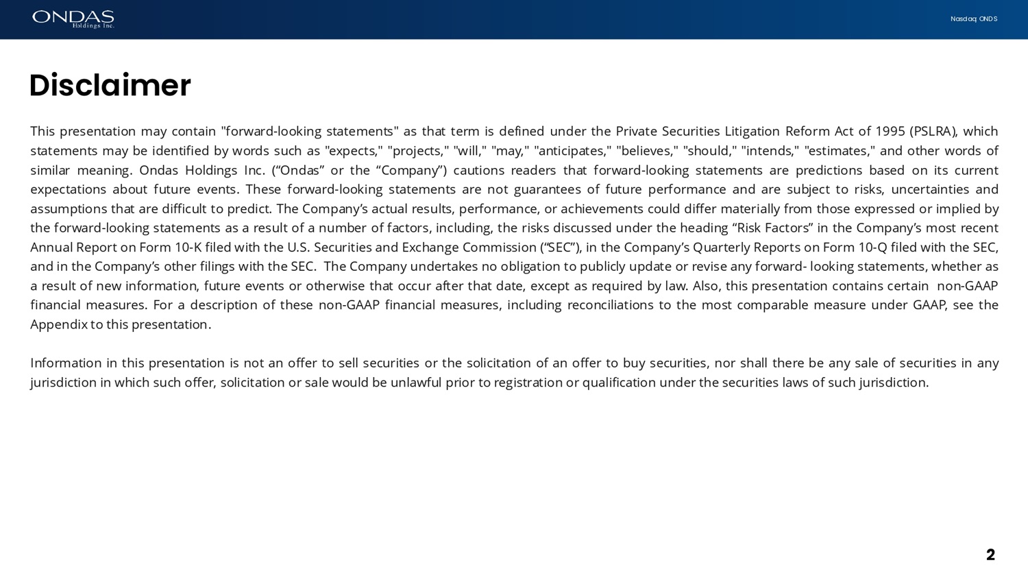 N a s d a q : O N D S This presentation may contain "forward - looking statements" as that term is defined under the Private Securities Litigation Reform Act of 1995 (PSLRA), which statements may be identified by words such as "expects," "projects," "will," "may," "anticipates," "believes," "should," "intends," "estimates," and other words of similar meaning . Ondas Holdings Inc . (“Ondas” or the “Company”) cautions readers that forward - looking statements are predictions based on its current expectations about future events . These forward - looking statements are not guarantees of future performance and are subject to risks, uncertainties and assumptions that are difficult to predict . The Company’s actual results, performance, or achievements could differ materially from those expressed or implied by the forward - looking statements as a result of a number of factors, including, the risks discussed under the heading “Risk Factors” in the Company’s most recent Annual Report on Form 10 - K filed with the U . S . Securities and Exchange Commission (“SEC”), in the Company’s Quarterly Reports on Form 10 - Q filed with the SEC, and in the Company’s other filings with the SEC . The Company undertakes no obligation to publicly update or revise any forward - looking statements, whether as a result of new information, future events or otherwise that occur after that date, except as required by law . Also, this presentation contains certain non - GAAP financial measures . For a description of these non - GAAP financial measures, including reconciliations to the most comparable measure under GAAP, see the Appendix to this presentation . Information in this presentation is not an offer to sell securities or the solicitation of an offer to buy securities, nor shall there be any sale of securities in any jurisdiction in which such offer, solicitation or sale would be unlawful prior to registration or qualification under the securities laws of such jurisdiction . 2 D i s c l a i m e r