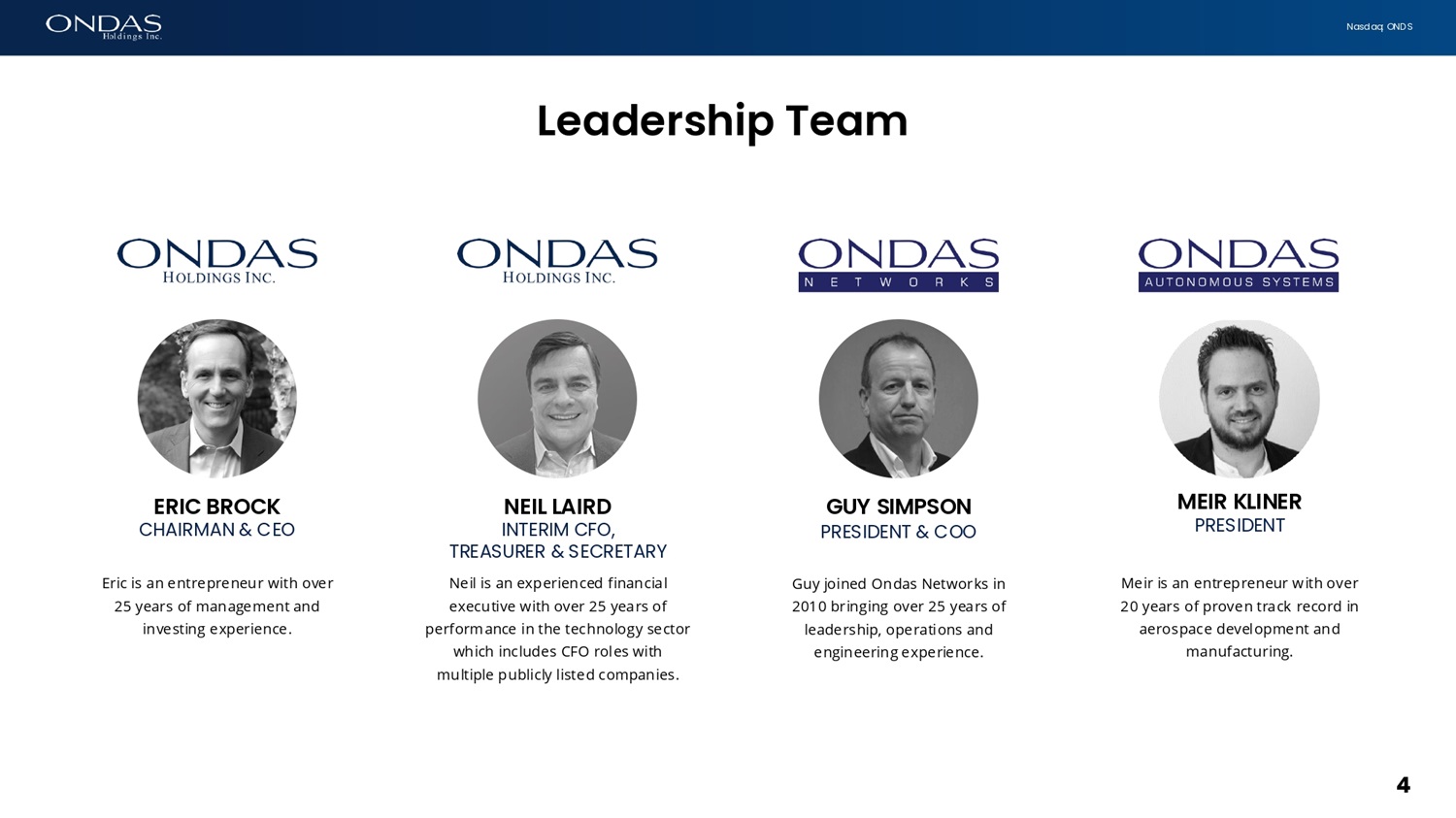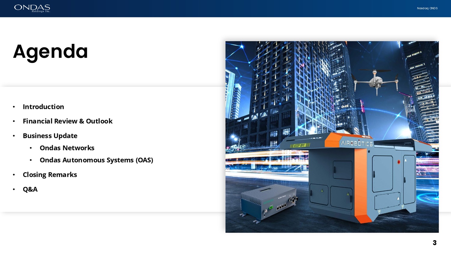 N a s d a q : O N D S Ag e f i da 3 • Introduction • F i n a nc i a l R e v i e w & O u t l o o k • B u s i n e s s U pd a t e • Ondas Networks • Ondas Autonomous Systems (OAS) • Closing Remarks • Q&A