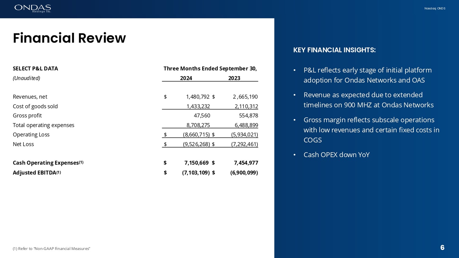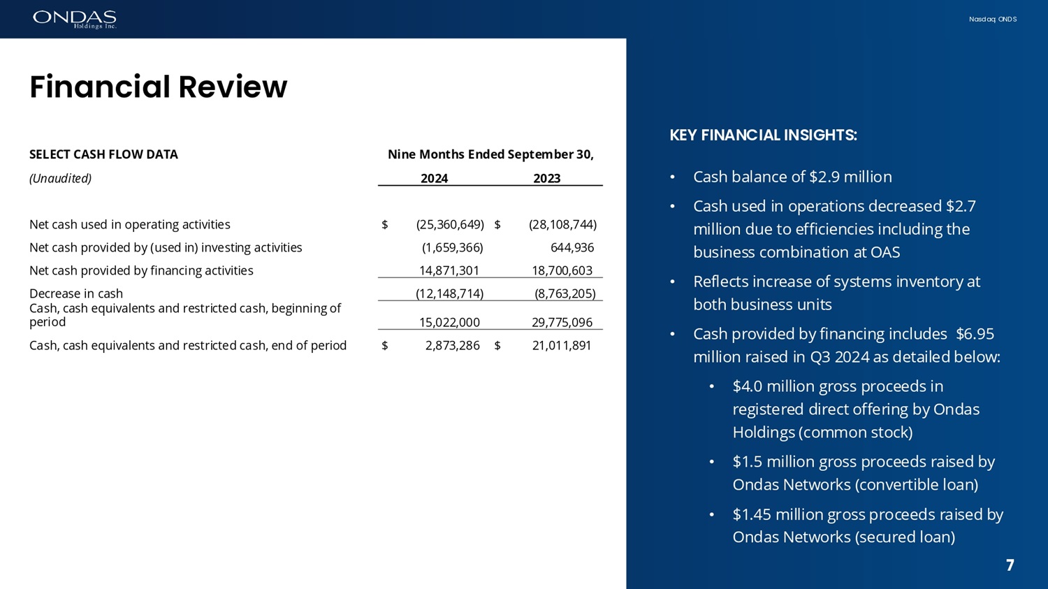 6 N a s d a q : O N D S K E Y F I N A N C I A L I N S I G H T S : • P&L reflects early stage of initial platform adoption for Ondas Networks and OAS • Revenue as expected due to extended timelines on 900 MHZ at Ondas Networks • Gross margin reflects subscale operations with low revenues and certain fixed costs in COGS • C a s h O P E X d o w n Y o Y (1) Refer to “Non - GAAP Financial Measures” Fifiaficial Review 6 T h r e e M o n t h s E n d e d S e p t e m b e r 30 , S E L E C T P & L D A T A 2023 2024 (Unaudited) $ 2 ,665,190 $ 1,480,792 R e v e nu e s , n e t 2,110,312 1,433,232 C o s t o f g oo d s s o l d 554,878 47,560 G r o s s p r of i t 6,488,899 8,708,275 Total operating expenses $ (5,934,021) $ (8,660,715) Operating Loss $ (7,292,461) $ (9,526,268) Net Loss $ 7,454,977 $ 7,150,669 C a s h O p e r a t i n g E x p e n s e s ( 1 ) $ (6,900,099) $ (7,103,109) A d j u s t e d E B I T D A ( 1 )