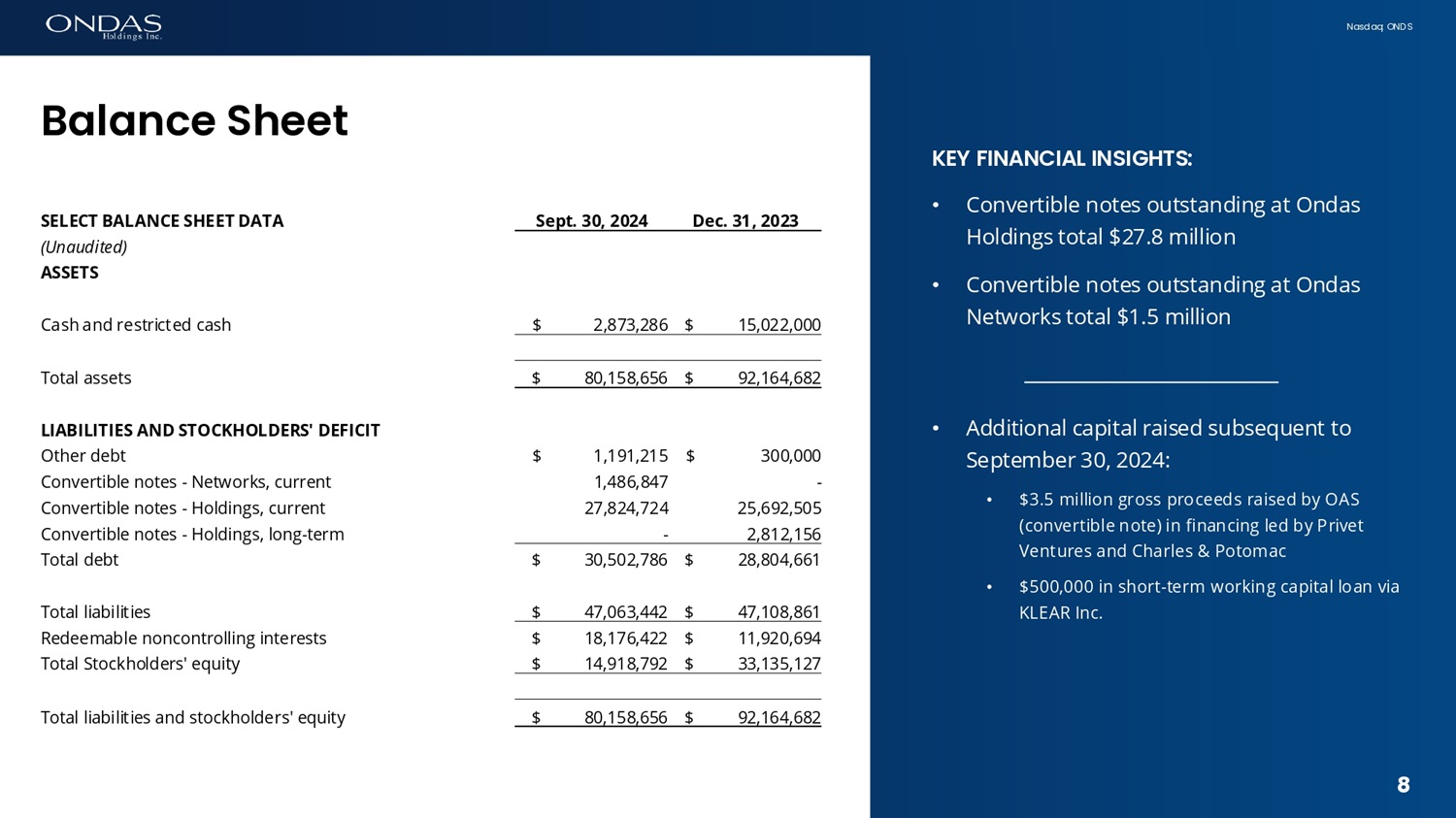 N a s d a q : O N D S K E Y F I N A N C I A L I N S I G H T S : • Cash balance of $2.9 million • Cash used in operations decreased $2.7 million due to efficiencies including the business combination at OAS • Reflects increase of systems inventory at both business units • Cash provided by financing includes $6.95 million raised in Q3 2024 as detailed below: • $4.0 million gross proceeds in registered direct offering by Ondas Holdings (common stock) • $1.5 million gross proceeds raised by Ondas Networks (convertible loan) • $1.45 million gross proceeds raised by Ondas Networks (secured loan) 7 7 Fifiaficial Review N i n e M o n t h s E n d e d S e p t e m b e r 3 0 , S E L E C T C A S H F L OW D A T A 2023 2024 (Unaudited) $ (28,108,744) $ (25,360,649) Net cash used in operating activities 644,936 (1,659,366) Net cash provided by (used in) investing activities 18,700,603 14,871,301 Net cash provided by financing activities (8,763,205) (12,148,714) Decrease in cash 29,775,096 15,022,000 Cash, cash equivalents and restricted cash, beginning of period $ 21,011,891 $ 2,873,286 Cash, cash equivalents and restricted cash, end of period