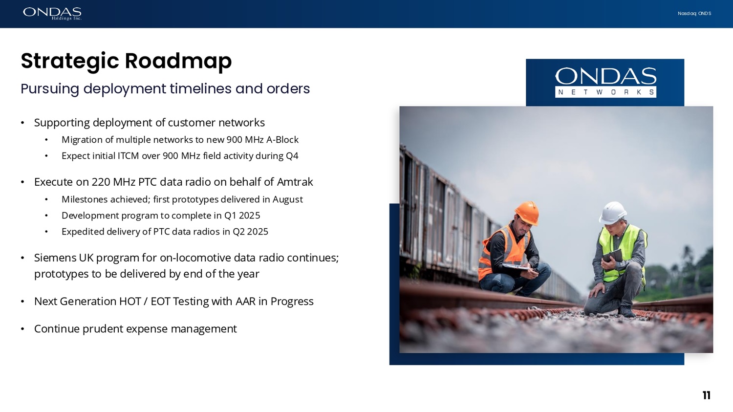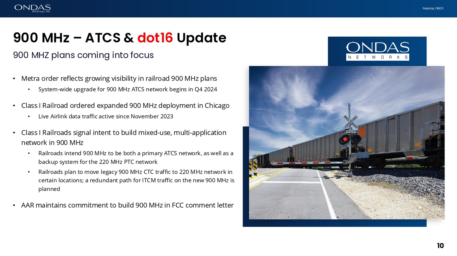 N a s d a q : O N D S 9 0 0 M H z – A T C S & d o t 1 6 U p d a t e 10 90 0 MH Z p l a n s c o m i n g i n t o f o c u s • Metra order reflects growing visibility in railroad 900 MHz plans • S ys t e m - w i d e u p g r a d e f o r 90 0 M H z A T C S n e t w o r k b e g i n s i n Q 4 20 2 4 • Class I Railroad ordered expanded 900 MHz deployment in Chicago • Live Airlink data traffic active since November 2023 • Class I Railroads signal intent to build mixed - use, multi - application network in 900 MHz • Railroads intend 900 MHz to be both a primary ATCS network, as well as a b a c k u p s ys t em f o r t h e 22 0 M H z P T C n e t w o r k • Railroads plan to move legacy 900 MHz CTC traffic to 220 MHz network in certain locations; a redundant path for ITCM traffic on the new 900 MHz is planned • AAR maintains commitment to build 900 MHz in FCC comment letter