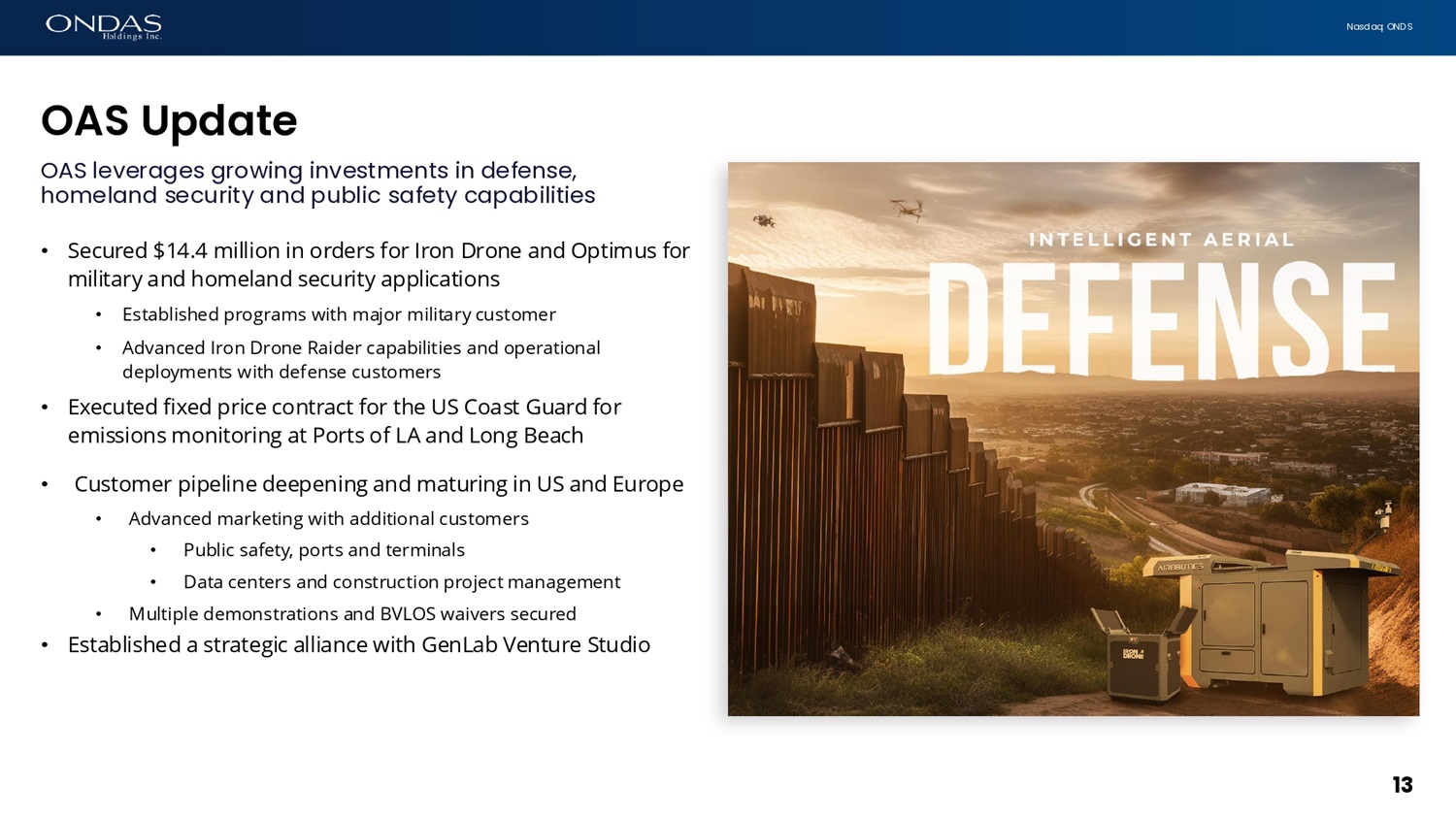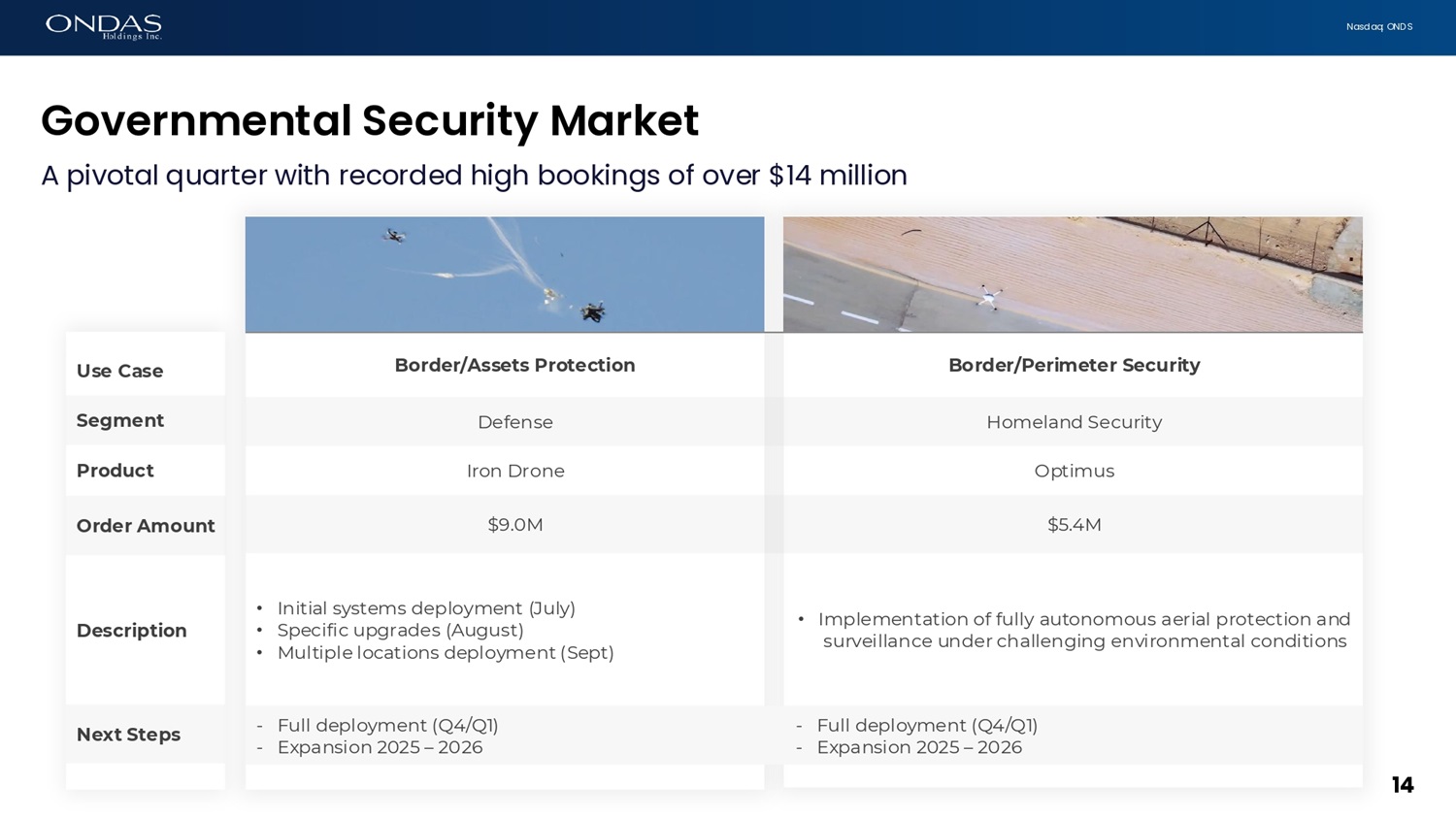 N a s d a q : O N D S OAS Update 13 OAS leverages growing investments in defense, homeland security and public safety capabilities • Secured $14.4 million in orders for Iron Drone and Optimus for military and homeland security applications • Established programs with major military customer • Advanced Iron Drone Raider capabilities and operational deployments with defense customers • E x ec u t e d f i x e d p r i c e c o n t r ac t f o r t h e U S C oa s t G u a r d f o r e m i s s i o n s m o n i t o r i n g a t P o rt s o f L A a n d L o n g B e ac h • C u s to m e r p i pe l i n e de e p e n i n g a n d m a t u r i n g i n U S a n d E u r o p e • Advanced marketing with additional customers • Public safety, ports and terminals • Data centers and construction project management • Multiple demonstrations and BVLOS waivers secured • Established a strategic alliance with GenLab Venture Studio