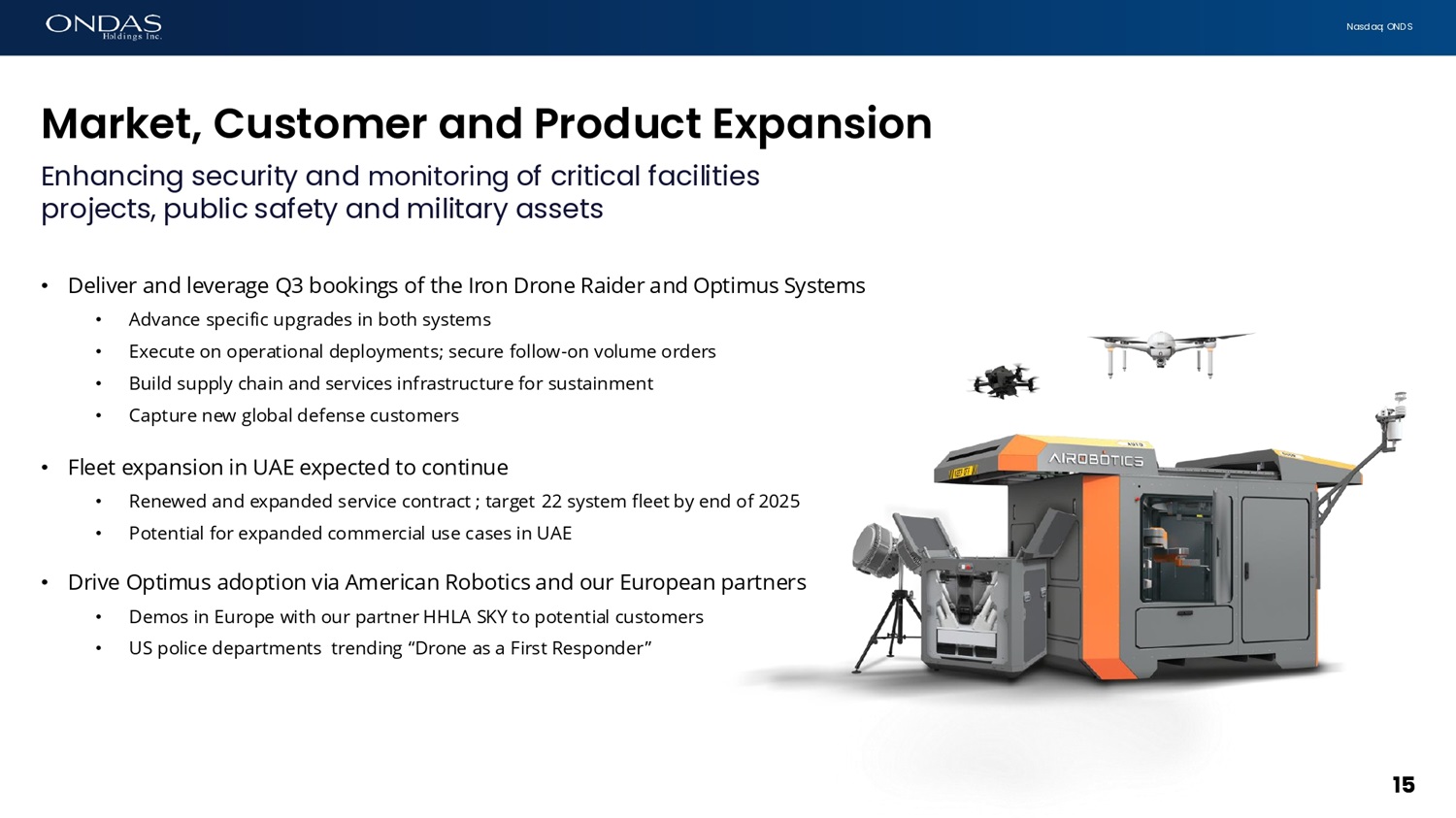N a s d a q : O N D S Goverfimefital Security Market A pivotal quarter with recorded high bookings of over $14 million U s e C a se Segment Product O r d e r A mo unt Description N e x t S t e ps B o r d e r / P e r i m e t e r S e c u r i ty B o r d e r / A s s e ts P r o t e c t i o n H o m e l a n d S e c u r i t y Defense Optimus I r o n D r o n e $5.4M $9.0M • I m p l e m e n t a t i on of f u l l y a u t o n omo u s a e r i a l p r o t e c t i on a n d surveillance under challenging environmental conditions • I n i t i a l s y s t e ms d e p l o y m e n t ( J u l y ) • Sp e c i f i c u p g r a d e s ( A u g u s t ) • M u l t i p l e l o c a t i o n s d e p l o y m e n t ( S e p t ) - F u l l d e p l o y m e n t ( Q 4 / Q 1 ) - E x p a n s i o n 2 0 2 5 – 2 0 2 6 - F u l l d e p l o y m e n t ( Q 4 / Q 1 ) - E x p a n s i o n 2 0 2 5 – 2 0 2 6 14