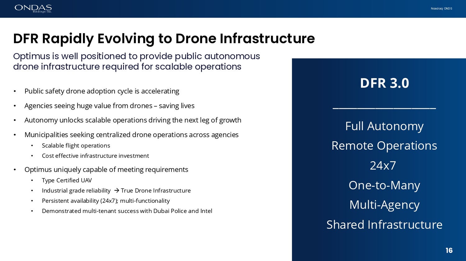 N a s d a q : O N D S Market, Customer afid Product Expafisiofi Enhancing security and monitoring of critical facilities p r o j e c t s , p u b li c s a f e t y a n d m il i t a ry a s s e t s • Deliver and leverage Q3 bookings of the Iron Drone Raider and Optimus Systems • Advance specific upgrades in both systems • Execute on operational deployments; secure follow - on volume orders • Build supply chain and services infrastructure for sustainment • Capture new global defense customers • Fleet expansion in UAE expected to continue • Renewed and expanded service contract ; target 22 system fleet by end of 2025 • Potential for expanded commercial use cases in UAE • Drive Optimus adoption via American Robotics and our European partners • Demos in Europe with our partner HHLA SKY to potential customers • US police departments trending “Drone as a First Responder” 15
