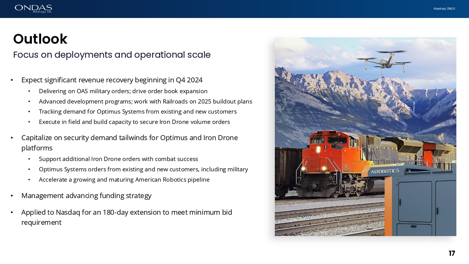 N a s d a q : O N D S • Expect significant revenue recovery beginning in Q4 2024 • Delivering on OAS military orders; drive order book expansion • Advanced development programs; work with Railroads on 2025 buildout plans • Tracking demand for Optimus Systems from existing and new customers • Execute in field and build capacity to secure Iron Drone volume orders • Capitalize on security demand tailwinds for Optimus and Iron Drone platforms • Support additional Iron Drone orders with combat success • Optimus Systems orders from existing and new customers, including military • Accelerate a growing and maturing American Robotics pipeline • Management advancing funding strategy • Applied to Nasdaq for an 180 - day extension to meet minimum bid requirement Outlook F o c u s o n d e p l o y m e n t s a n d o p e r a t i o n a l s c a l e 17