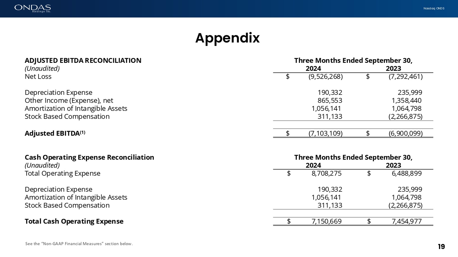 19 N a s d a q : O N D S See the “Non - GAAP Financial Measures” section below. Appefidix Three Months Ended September 30, A D J U S T E D E B I T D A R E CO N C I L I A T I O N 2023 2024 (Unaudited) $ (7,292,461) $ (9,526,268) Net Loss 235,999 190,332 Depreciation Expense 1,358,440 865,553 Other Income (Expense), net 1,064,798 1,056,141 Amortization of Intangible Assets (2,266,875) 311,133 Stock Based Compensation $ (6,900,099) $ (7,103,109) Adjusted EBITDA (1) Three Months Ended September 30, C a s h O p e r a t i n g E x p e n s e R e c o n c il i a t i o n 2023 2024 (Unaudited) $ 6,488,899 $ 8,708,275 Total Operating Expense 235,999 190,332 Depreciation Expense 1,064,798 1,056,141 Amortization of Intangible Assets (2,266,875) 311,133 Stock Based Compensation $ 7,454,977 $ 7,150,669 T o t a l C a s h O p e r a t i n g E x p e n s e